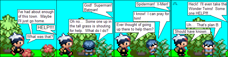 Now that Brendan has met May it's time for him to advance the plot some more and get his first pokémon. And that all starts with a cry for help. Of course, the little kid with grassphobia isn't going to actually help, not when it involves going into the grass. As for the joke dialogue, I have to admit that it wasn't entirely original. I got some inspiration for it from both a Simpsons episode and a comic that Brian of 8-bit Theater did. I do tend to pull an occasional name and/or joke from some of my favorite books, comics, etc but I don't directly copy anything and most of the time I change it around a lot. Actually, I kinda like it when people notice the little references I hide in my books and comics. It's just my way of saying "Hey, look! I really like whatever this is referring to!". Then again, there are also some things that look like references but are actually a total coincidence. Of course, while references are fun, it's important not to overdo them. You gotta keep most of your content as original as possible. |