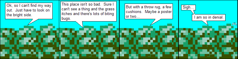 See how the grass looks the same in every panel? I really should have changed it a bit each panel. Even so, this is still one of my favorite strips. I just like the joke. Calm acceptance is all well and good but you need to knew when you're taking things too far.