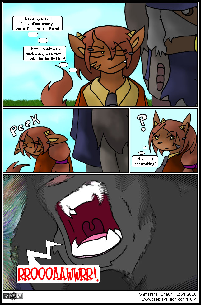 | ROM The Comic is based on the ROM RP from the Pebble Version forums. All characters are property of their respective oweners. The art and comic itself are the property of Samantha "Shauni" Lowe. ROM is hosted as a part of Pebble Version. |