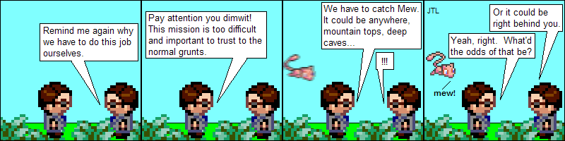 | Looking Back: From the beginning, I always wanted Pebble Version to have more to it than Brendan and May following the plot of the games. Not that they wouldn't go through all the game stuff, but I wanted an original story in there as well, one that would eventually even makes some changes to the main plot. However, I planned for the new plot to take over gradually (very, very gradually) so I knew it would be a long time before things really got going. But since it was going to take such a long time (far longer than I originally thought), I decided to work in some little bits and pieces of the new plot here and there, just so people would know it exists. This mew hunt arc is the first part of that new plot. With the 100th strip coming up, I wanted to do something special. Most sprite comic authors do a '100th strip' special, usually a party of sorts with lots of characters, the author, and no fourth wall what-so-ever (as in, it has no bearing on the main plot and characters typically know that they're in a comic and act accordingly). Bob & George, one of the oldest (and most copied) sprite comics in existence, started the whole party strip concept. I, on the other hand, had no intention of ripping off Bob & George (way too many comics did that already) and didn't want to break the fourth wall either. But how could I do something special for the 100th strip without breaking the fourth wall? I decided to do two things. The first was to change the scene away from Brendan and May for a little while, just for a change of pace. And the second? The scene change gave me the perfect opportunity to show a little bit of the original plot I had planned, and so the mew hunt began. I think the strip speaks for itself and introduces both the legendary pokémon mew (who doesn't normally appear in Pokémon Ruby/Sapphire) and the mysterious duo currently known only as 'The Black Suit Guys'. |