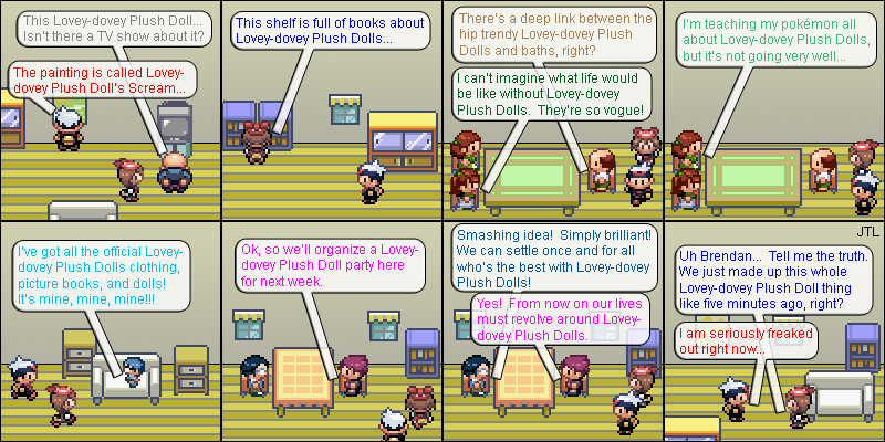 | Looking Back: This is one of the very rare PV strips that's longer than four panels. At the time, I knew I couldn't fit all the Lovey-dovey Plush Doll stuff into four panels, but I also couldn't think of a good way to split this into two comics, at least not without sacrificing the punch line in one of them. That said, it's not an approach I took very often and, at this point, I've pretty much abandoned it. First off, double length strips take longer to make. Second, the larger size doesn't work very well in my main page's layout. Still, I suppose I might do more double length strips in the future if the story warrants it, but I'd say it's generally something I want to avoid these days. All that aside, pretty much all the characters and Lovey-dovey Plush Doll stuff in this strip was taken directly (give or take) from the game. While having a bunch of trend chasing super fans is nothing too ridiculous, the question is how the heck they already know so much about, and got so much merchandise for, something you made up a few minutes or seconds ago. Even if we assume that Brendan and May told them about a real thing, there's no way they could become experts on it so quickly. Maybe they just have a bunch of fill in the blank labels and conversation topics they use every time they hear about a new trend to try and convince people that they're hip. That'd be kinda pathetic, but it's about the only way to explain it. |