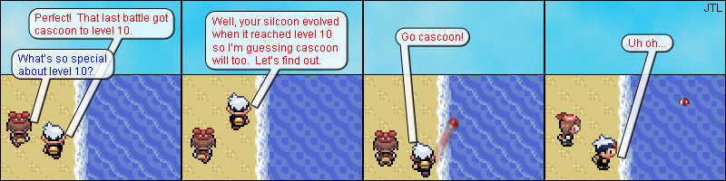 Looking Back: Ah, Brendan's bad aim with pokéballs. Over time, that joke eventually faded away. Now, I actually can't remember the last time I did a strip with it. On some level, I think I kind of forgot about it after a while. But it was also rather deliberate, since it only makes sense for Brendan to get better with practice. Plus, repeating the same gag too many times can get boring and predictable. |