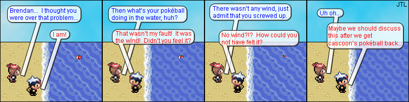Brendan's speech bubble in the fourth panel bugs me. It's weird to have such a large empty space on the second line. I should have made the bubble a bit wider so I could have fit "cascoon's" on that line. Normally I'm pretty careful to avoid weird spacing like that. I even rewrite dialogue some times just to fit the bubbles better. So what happened here? I'm not sure. I guess I just wasn't as picky back then. Or maybe not as good at layout tweaking. And I never went back and cleaned up this strip like I did some up the older ones (I didn't go back quite this far when I was doing that). Oh well, maybe I'll fix it eventually, though that would also make this commentary obsolete... |