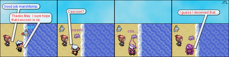 Cascoon clearly isn't too happy about what happened. Though, now that I think about it, you have to wonder just how much pokémon know about what's going on outside of their pokéballs. In the Adventures manga, they seem to be able to see and hear outside. Though I don't recall the anime ever showing anything like that (at least not up to the point where I stopped watching). And I don't remember the games ever addressing the issue either. Since Pebble Version is loosely inspired by Adventures in addition to the games, I suppose I'll go with that approach and say that the pokémon can see and hear what's happening outside, at least somewhat. |