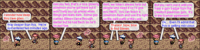 Why exactly do you need specific gym badges before you can use HMs like Flash? Game balance, of course! But if we want a more logical reason... The HMs would have to be key coded some how with the badges working to unlock or activate them. Presumably as some sort of system created by the Pokémon League to make sure that trainers progress along a set route and don't get ahead of themselves. In this case, they want to make sure you clear the Dewford gym before you go exploring any caves (or finding Steven). So, on to the gym! |