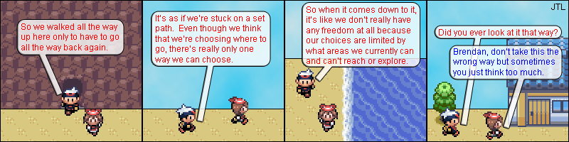 Looking Back: Brendan is considering one of life's great philosophical questions, the existence of free will. Of course, in his case, we know the answer. While you can debate the presence of free will in the real world, it's something that video game characters certainly don't have. Especially in linear titles like Pokémon where there's really only one way to progress through the games. |