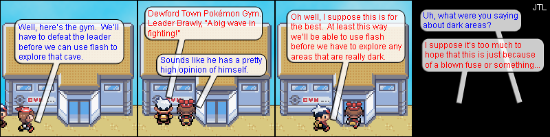 It's kind of ironic that, in order to get the ability to light up dark areas, you have to make your way through a dark area. Though the way darkness works in the games, you can still see a little bit immediately around your main character. That's not all that realistic though, and just having everything really dark is much better for jokes. It would be kind of an annoying gym to work in though. Just stand around all day in the dark and see if anyone bumps into you. Yeah... Not much fun at all. |