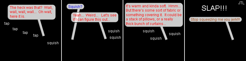 And the mystery is solved. Looks like finding other trainers wasn't so hard after all. When I made this strip, I soon realized that it could easily be interpreted as Brendan squeezing a very specific part of a girl's anatomy. Of course, there's nothing really wrong with that as far as the gag goes. It certainly happens all the time in anime. However, I like to keep Pebble Version to a G or PG rating, so I decided to use the title to clarify things a bit. |