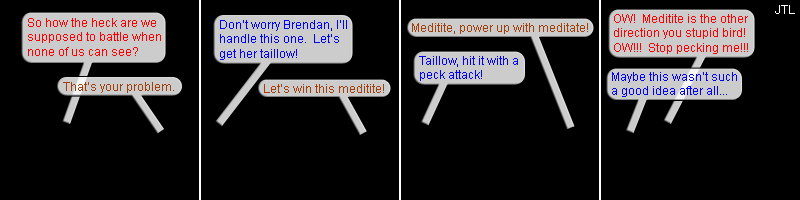 Looking Back: Of course, right now, as I'm writing this commentary, I come up with a much better title for this strip. Sigh... Anyway, battling in the dark! Unless one or both of the pokémon have night vision or some other really good senses, it'd be really tough to actually hit the opponent. Of course, this comic would probably be a bit funnier if you could actually see what's going on, but then it wouldn't make sense. And it would have been more work... |