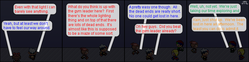 Looking Back: It's Xain and Cali! Though, if you don't know their text colors, you may have a little trouble figuring out who is talking considering how dark things are. Maybe I should have had someone say their names. Anyway, while it actually doesn't come up much in the comic, Xain and Cali actually are traveling around and collecting gym badges as well. Though how they managed to find the gyms, much less defeat the gym leaders, is anyone's guess. |