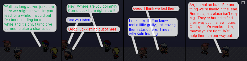 While he'd never actually admit it, deep down Xain does have at least a vague idea that he's not great with directions. Maybe. On a side note, in case I never mentioned it before, Xain's bad sense of direction was inspired by the character Ryoga from Ranma 1/2, whose sense of direction is so bad it essentially warps the laws of time and space. |