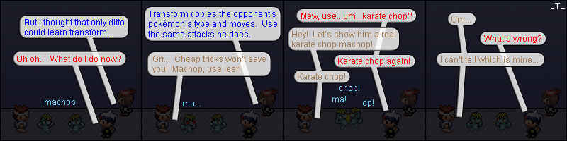 In most cases, transform is fairly useless in the games since it is mainly used by ditto and ditto's stats aren't especially great. So you've got two pokémon with identical types and moves (most of which don't work well against each other) fighting, but one has notably weaker stats. However, they eventually added some special ditto exclusive hold items that, when used properly, can actually give ditto a fighting chance, at least in some battles. I actually have a battle-ready ditto as part of my team (well, a sub-member anyway). All that said, mew is generally the better transform user thanks to its solid all-around stats. In a match-up like the one in this strip, mew would win. |