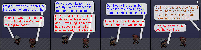 Not much to say about this one. Other then it's finally easier to see...not that there's much to see in this strip. But it does show that Brendan is starting to get more into battling, though not so much the rest of the whole pokémon journey. |