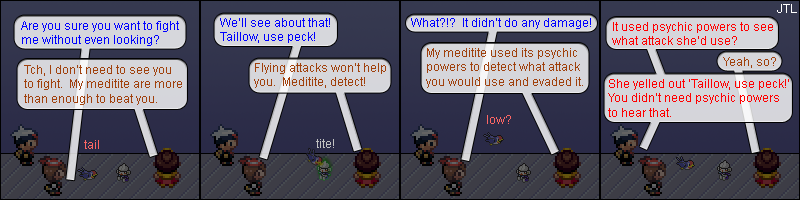 Looking Back: In the games, there are a few moves that allow you to completely nullify the next attack, detect being one of them. Though, those moves become increasingly unreliable the more times you use them in a row, and they take up your whole turn, so their usefulness is fairly limited. But yeah, considering that pokémon trainers generally have to yell out their attacks and battle strategies all the time, the ability to predict what your opponent will do next isn't actually all that useful. |