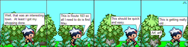 And it's a repeat of the joke from strips 31 and 35. Since there are three types of pokémon that appear in the tall grass around Littleroot and Oldale Towns, I figured I should do this once for each. But three times was definitely enough to get the point across and to show Brendan that random encounters can happen quite frequently. Wild pokémon really must enjoy getting beaten up by passing trainers, considering that seems to be about all that they ever do, at least in the frequently traveled areas. |