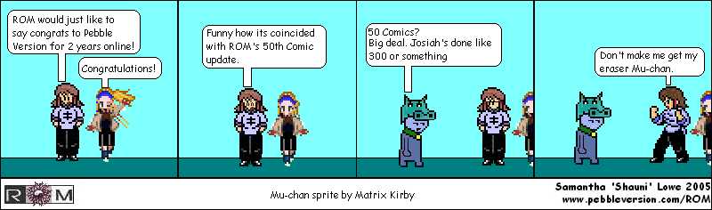 ROM The Comic is based on the ROM RP from the Pebble Version forums. All characters are property of their respective oweners. The art and comic itself are the property of Samantha "Shauni" Lowe. ROM is hosted as a part of Pebble Version. |