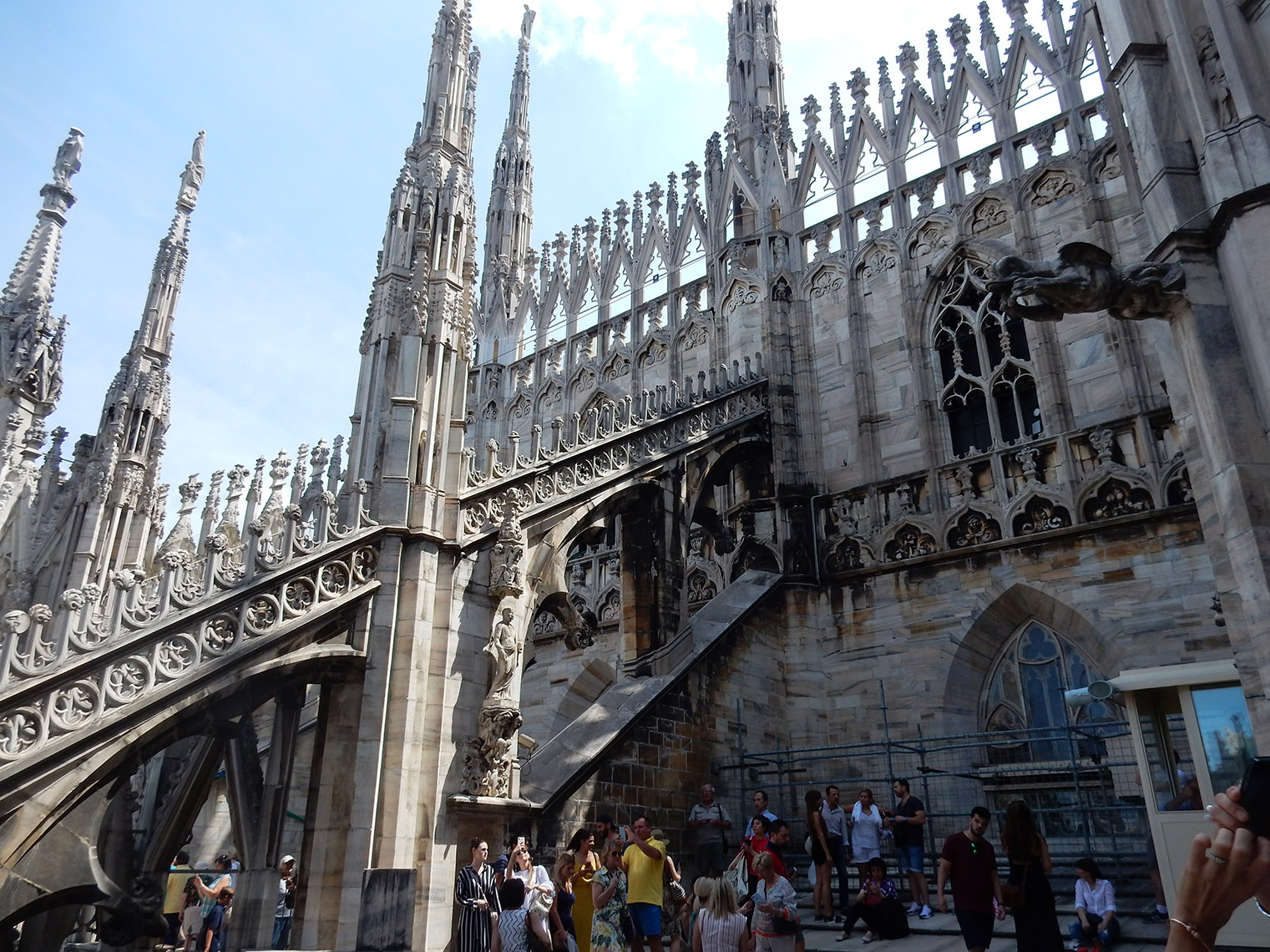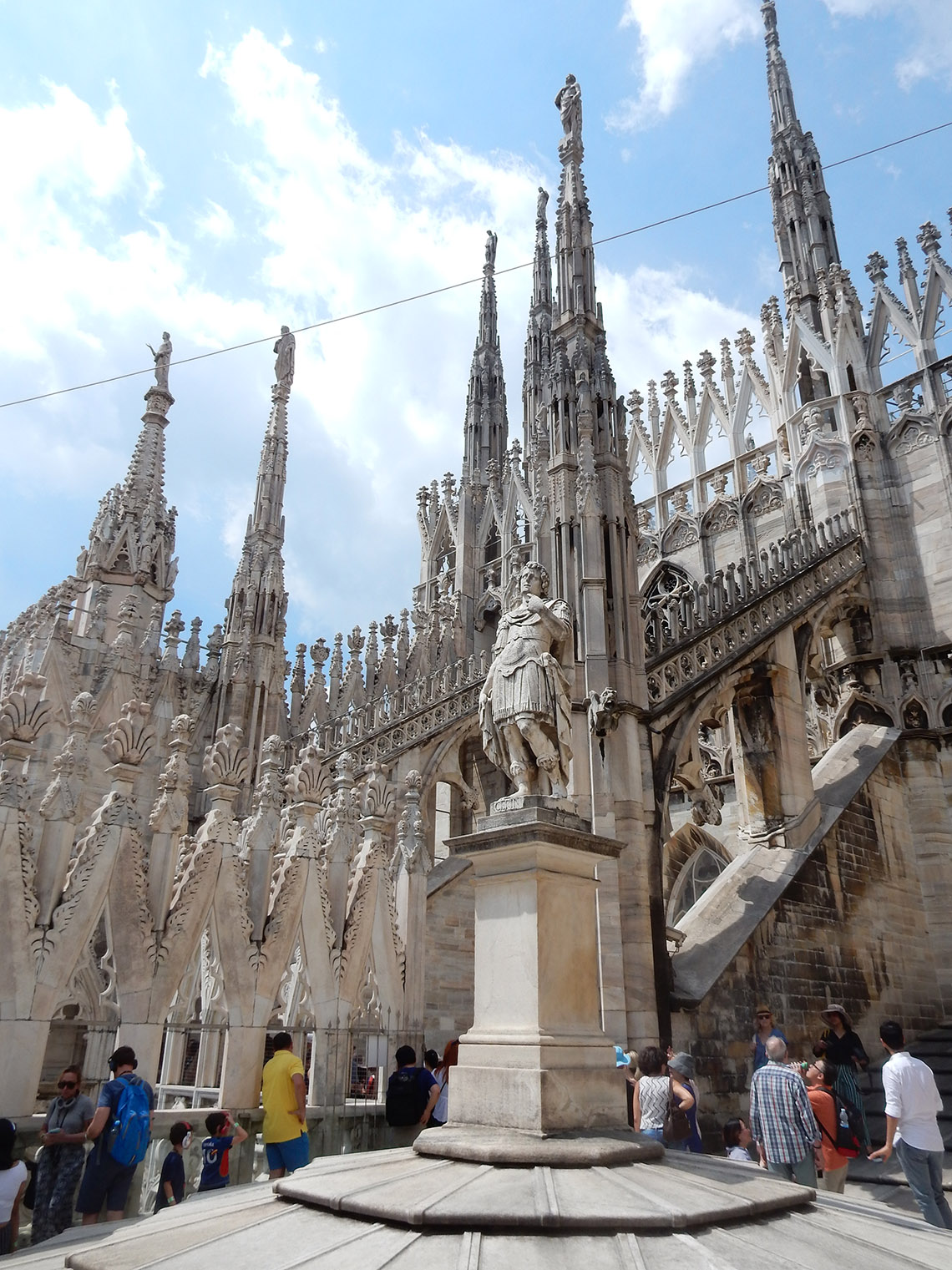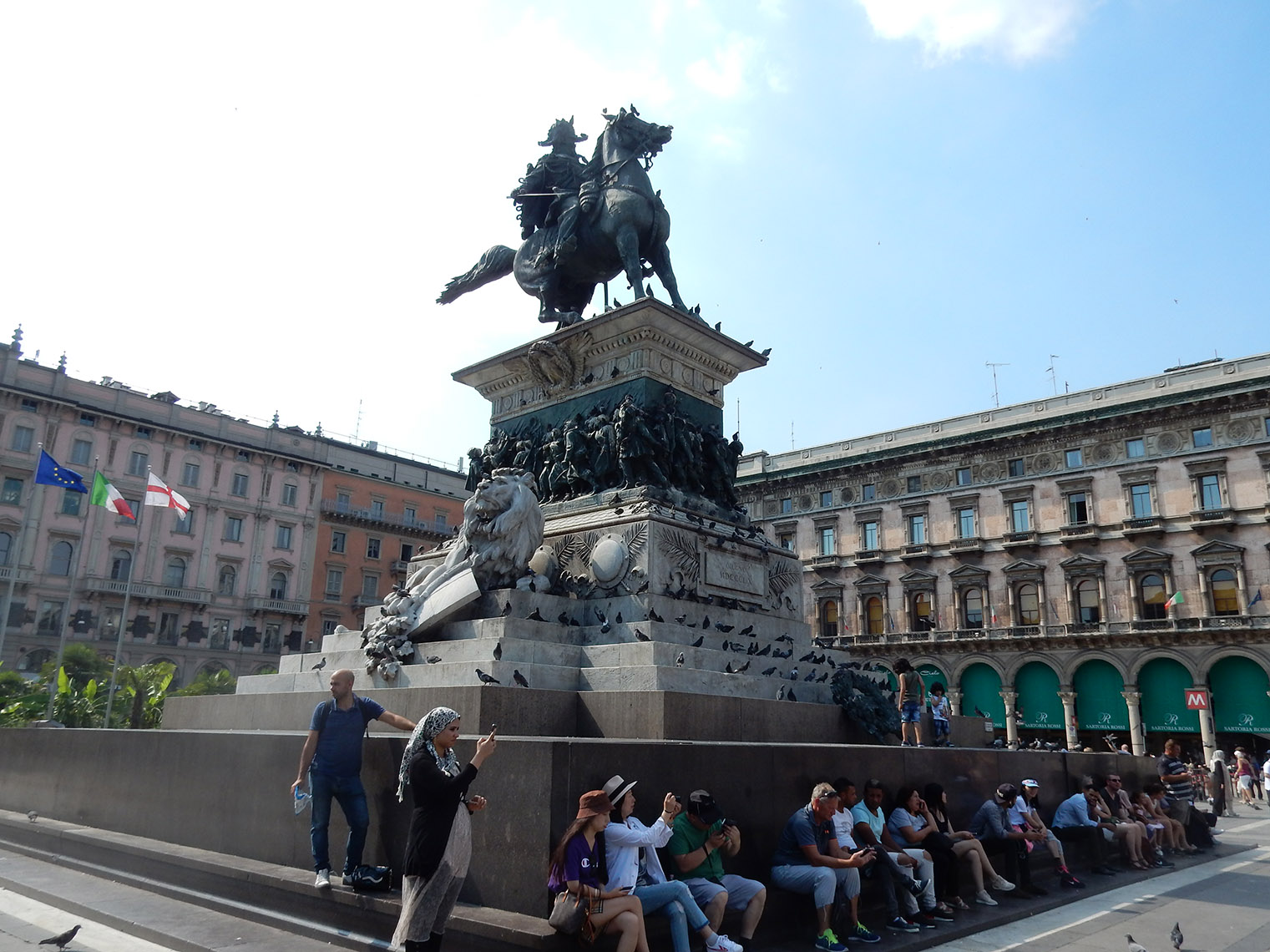 Exiting the Galleria, we found ourselves face to face with the extremely impressive Duomo di Milano. I've always loved high gothic architecture and the Duomo is a masterpiece, and the first major example I've been able to see in person. But I'll talk about it more in tomorrow's entry. Today all we did was walk around the outter walls and buy admission tickets for the next day. Why? Well, it was getting a little late and I didn't want to rush our visit. Plus, there was a decent length line waiting to get in, and I figured we could dodge that by hitting it first thing in the morning. But the main reason is that Zack was getting antsy after being carried around most of the day and really wanted to move around so we spent quite a while letting him chase pigeons in the piazza (plaza) outside the Duomo, which is dedicated to the Lord of the Pigeons, er, Vittorio Emanuele II. Though, honestly, he may have well been considering how many of the things were covering his statue and the surrounding piazza.