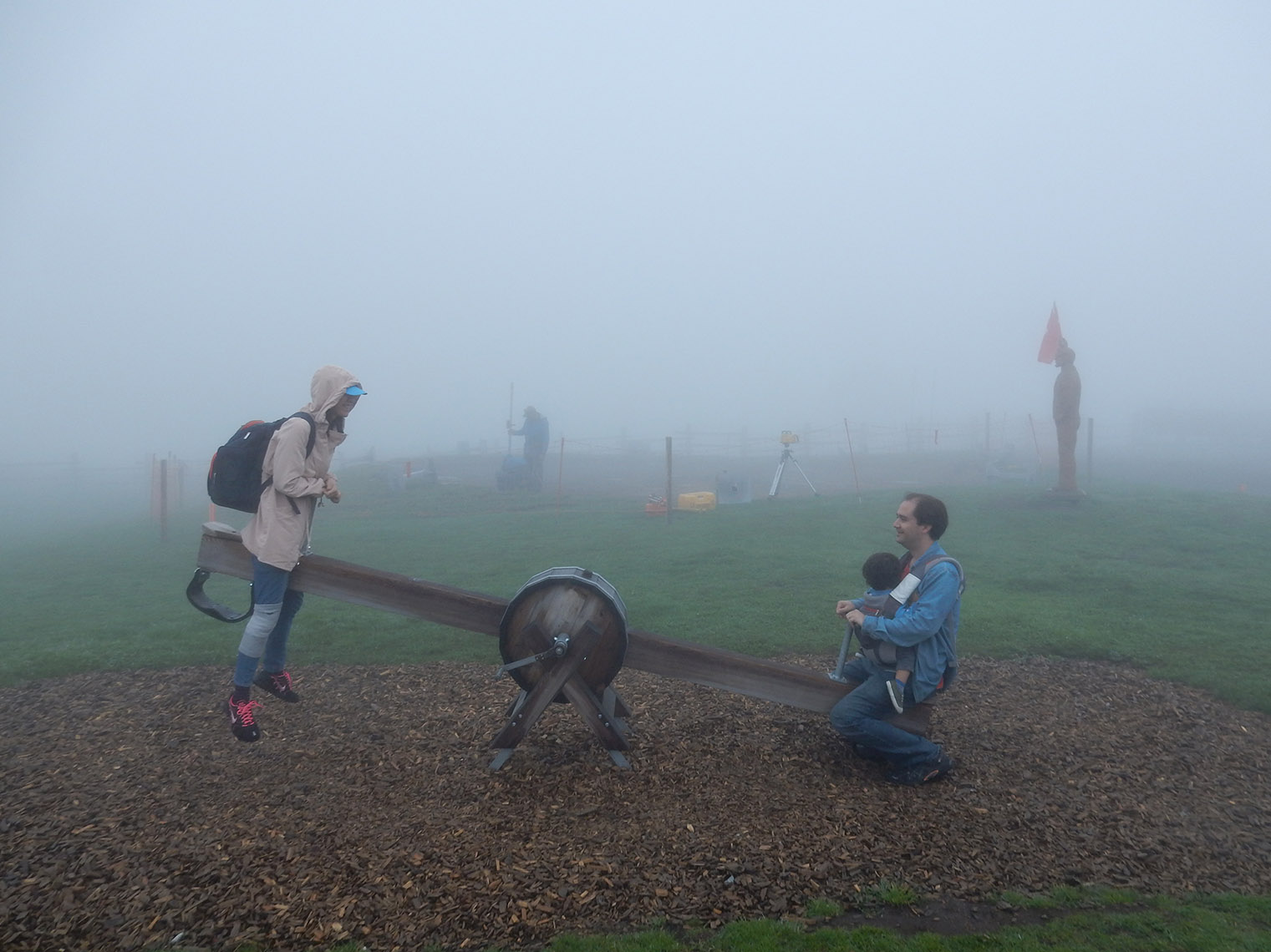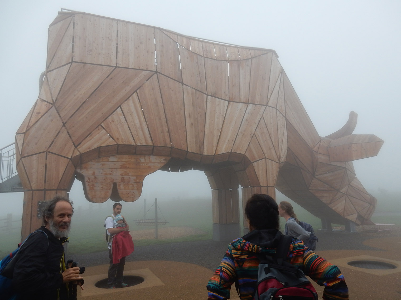 The weather forecast for the next couple of days was iffy, so my parents (who did most of the planning for this part of the trip) decided to do something where rain wouldn't be too much of a problem. Fortunately, the weather started out great and we walked to a cable car on the outskirts of town. The cable car was a long one, taking us up over forests and grassy slopes to the top of a nearby mountain. The top of the mountain was covered in a thick cloud, so we didn't stay long, but there was a really cool playground there complete with a giant wooden cow (you could climb up and enter via its butt and slide out on its tongue), outdoor bowling, and a lot of other fun stuff.