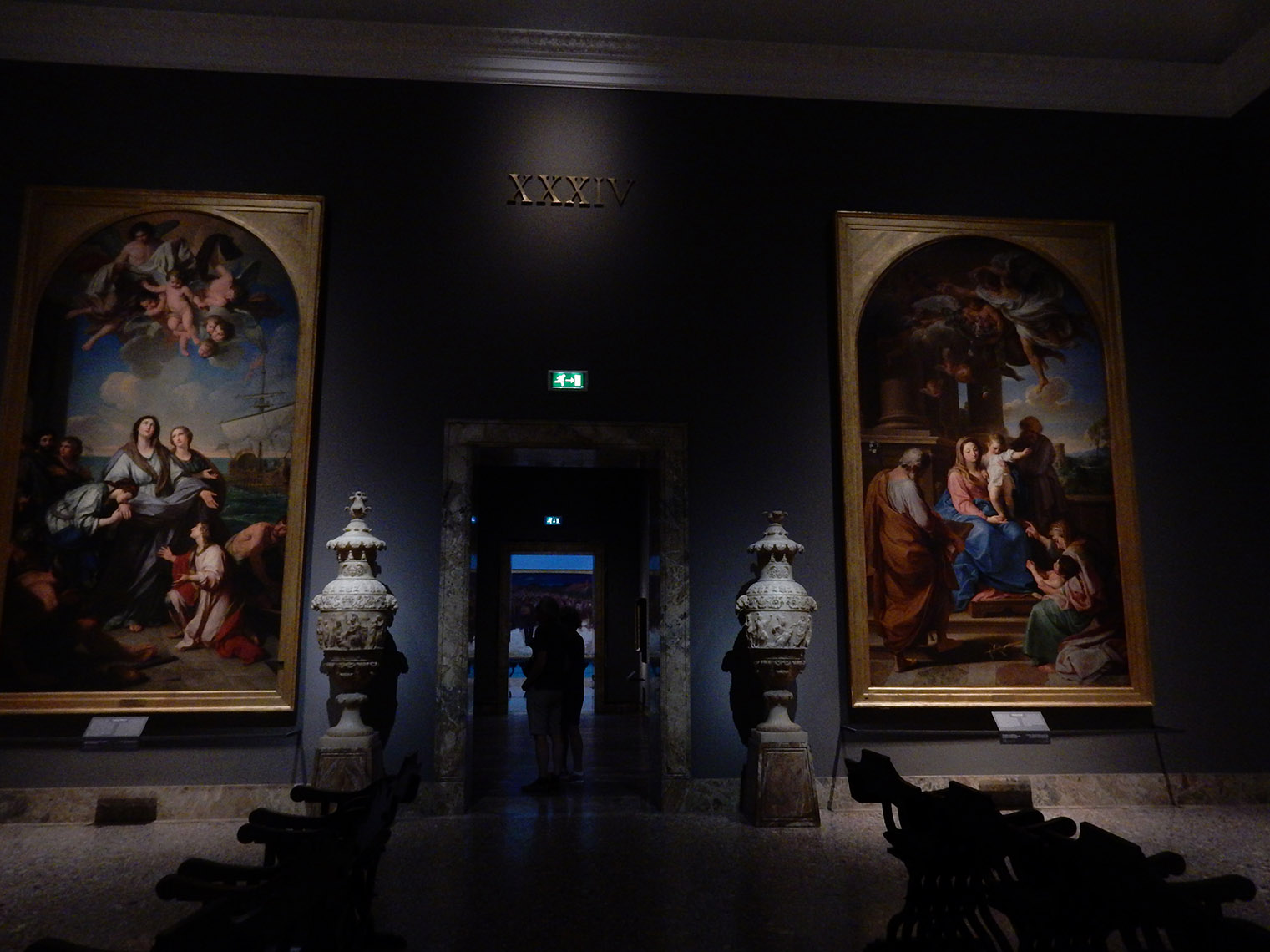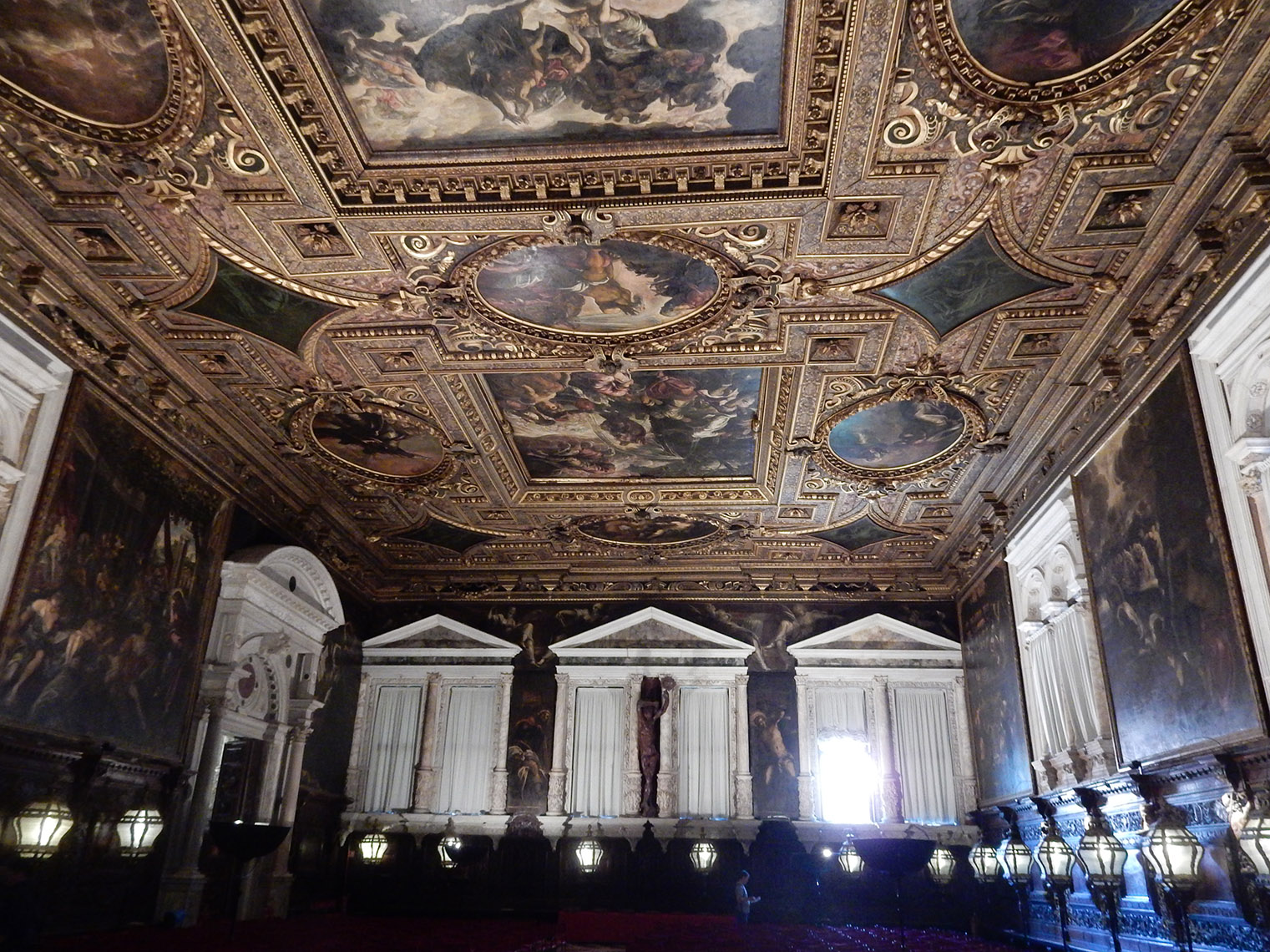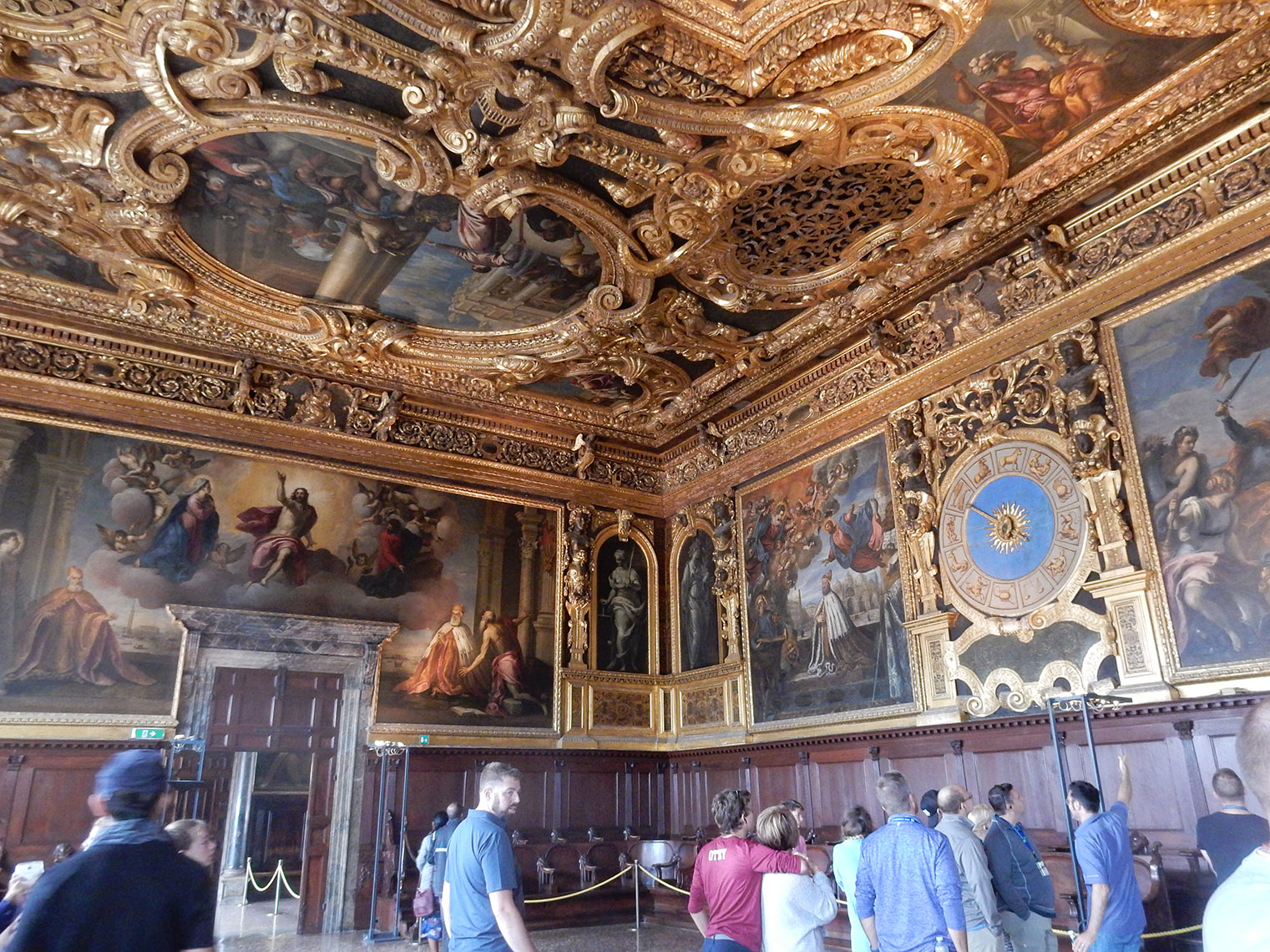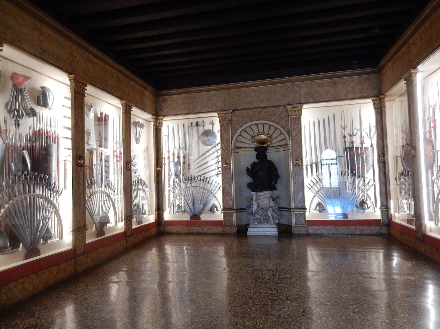 Once outside, we retrieved our bag then headed to the Doge's Palace. I had prepurchased tickets for it also, which let us skip a very long line. Though, unlike the Basilica, there was no time slot. Anyway, the Doge was the ruler of Venice (think a duke, or some such). Aside from the courtyard, the lower level had some rooms with statues and the like, but the vast majority of the things to see were on the upper levels (which required a bag check to access). The route started out with a series of elaborately decorated rooms which were used for various official functions, led through a cool collection of weapons and armor, and then over the poetically named Bridge of Sighs into the nearby prison before eventually circling back into the palace and through some private quarters. The variety was impressive and it was a fun and interesting mix of sights. As a side note, you can also book a special guided tour that focuses on secret passages, hidden rooms, and the like. Unfortunately, children under six aren't allowed, so I had to skip that one.