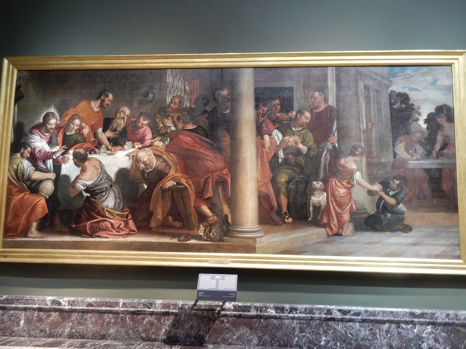 We wound our way to the Scuola Grande di San Rocco. A scuola was a group founded by influential private citizens of Venice sort of like an exclusive club. There were multiple scuolas and many of them later evolved into charitable groups, some of which are still operating today. This one had quite the fancy building, with detailed paintings all along the walls and even on the ceiling.