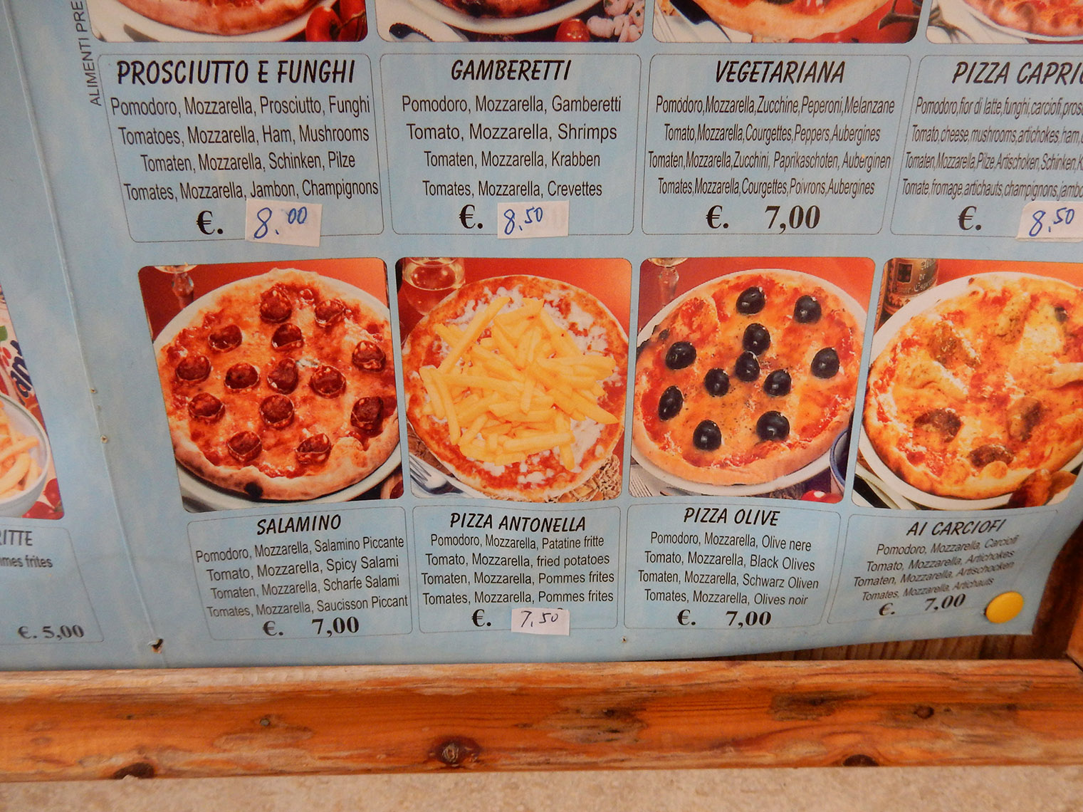 I already mentioned how eating out in Italy is pretty cheap. So what do you actually eat? Well, it might sound cliche but most of the restaurants really do primarily serve pasta and pizza (along with wine and coffee, if you're looking for drinks). As for street food, there's a lot of stands selling pizza slices. Though it's not like that's all Italians eat. Depending on the part of the country you're in, you may also find rice dishes, soups, and other slightly less common Italian foods. So what if you don't want to eat Italian? Well, I did see a moderate number of Asian places (mostly either sushi or Chinese) and doner kebabs.