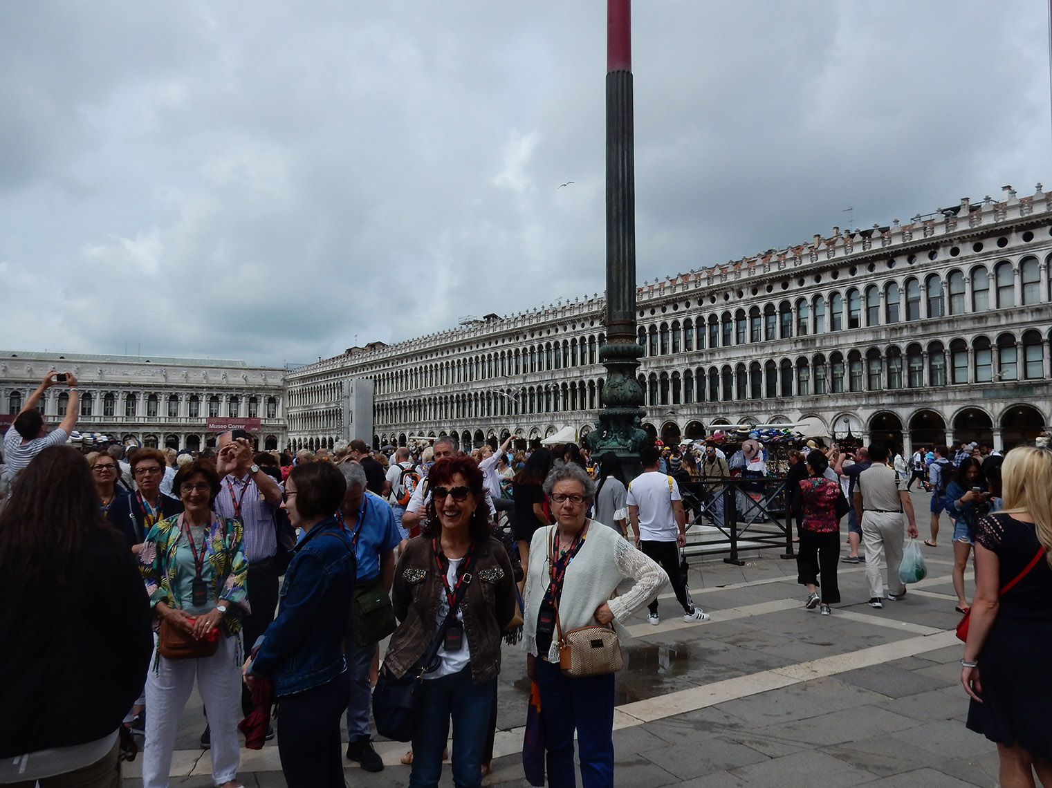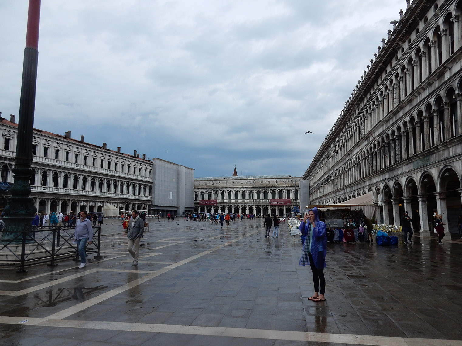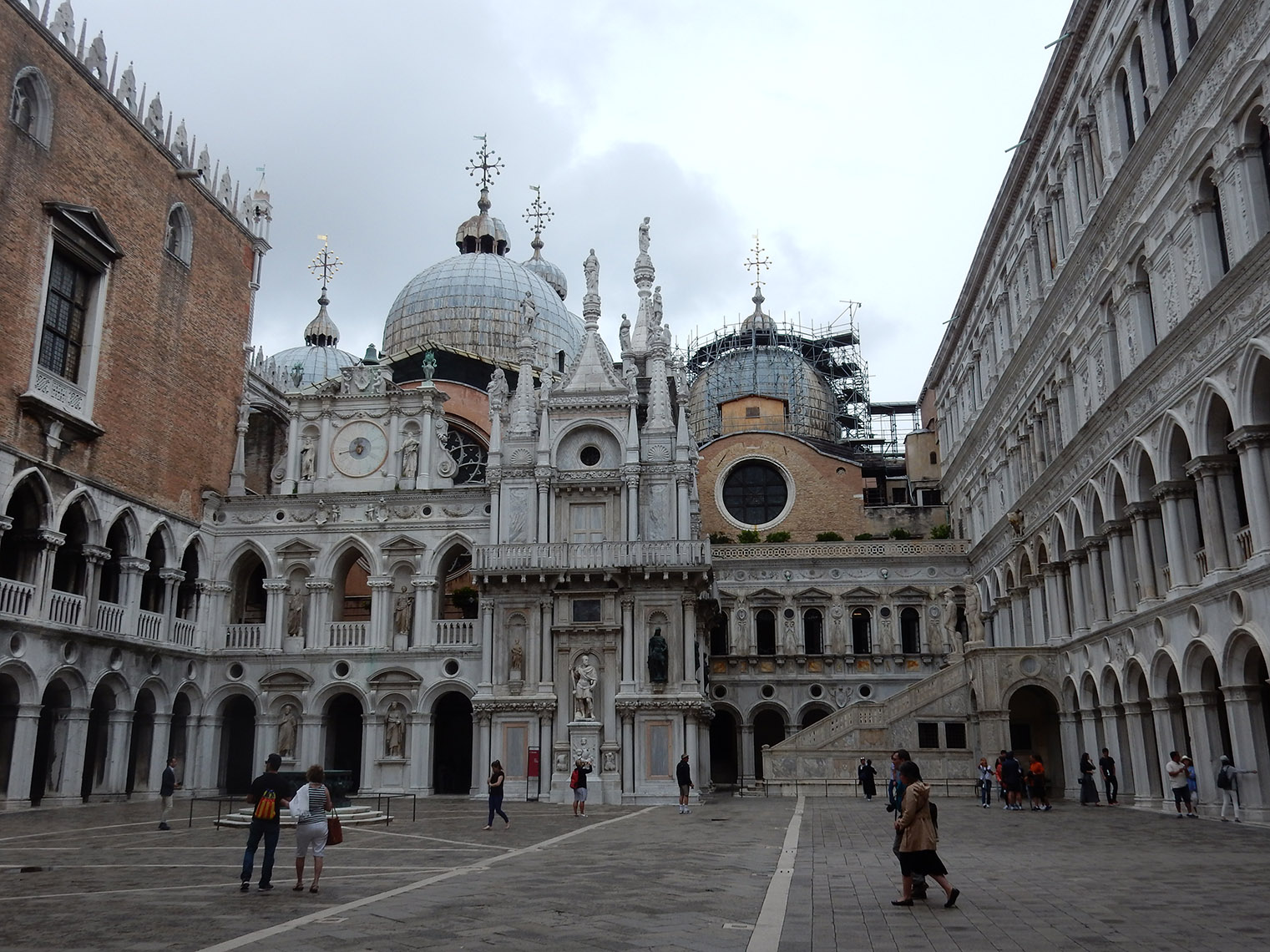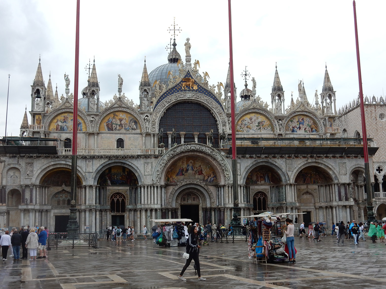 This was the day I planned to hit Venice's most popular sights since, being a weekday, they should be less crowded. I had also followed the advice from my tour book and purchased some tickets in advance online a while back so we got an early start and hopped on a vaporetto (Venice's boat equivalent of a bus) on the Grand Canal. Unfortunately, the weather that morning was cool and rainy and the vaporetto was packed so we didn't really get to enjoy the views. But things were starting to clear up by the time we disembarked at the Piazza San Marco.