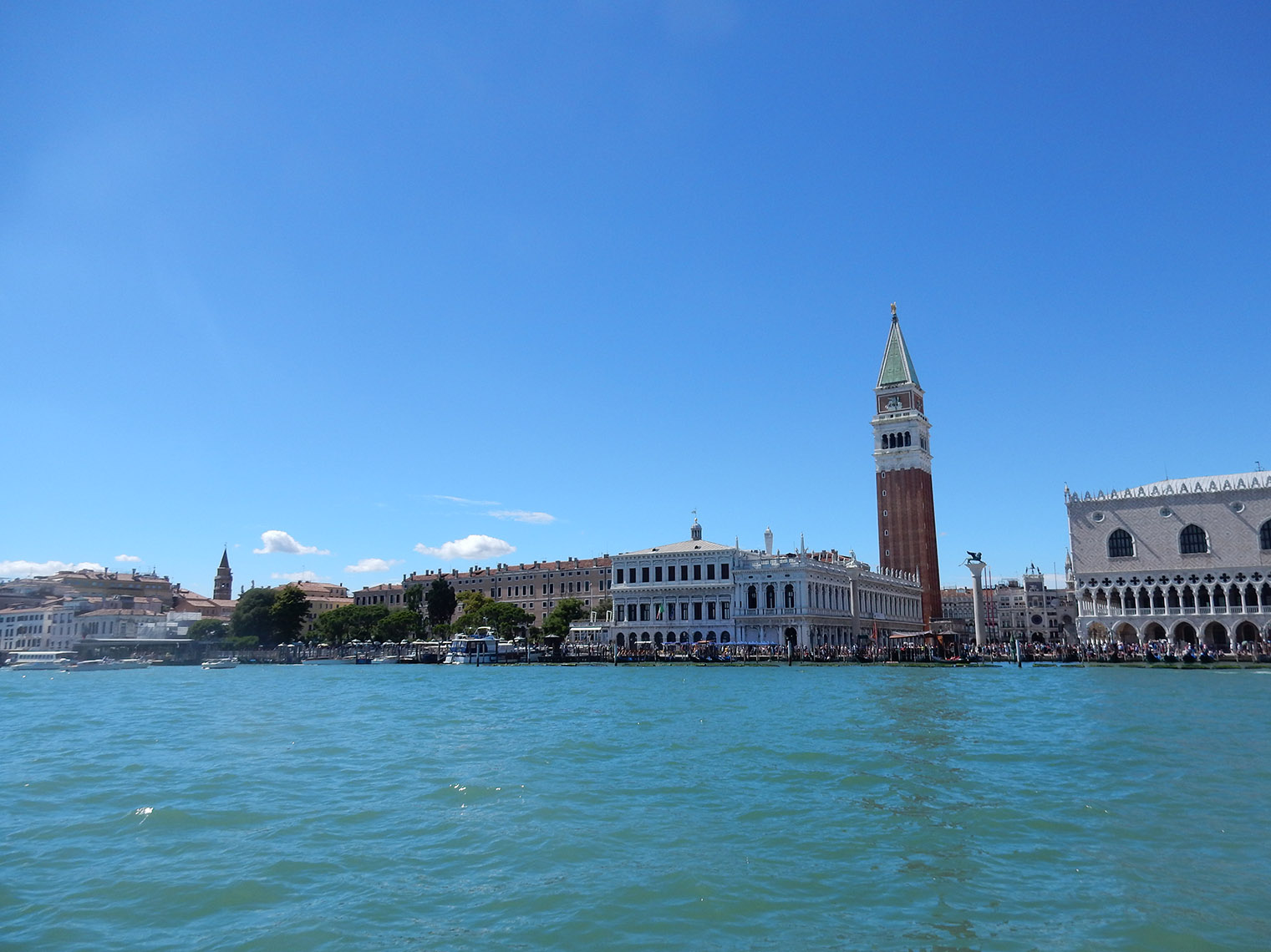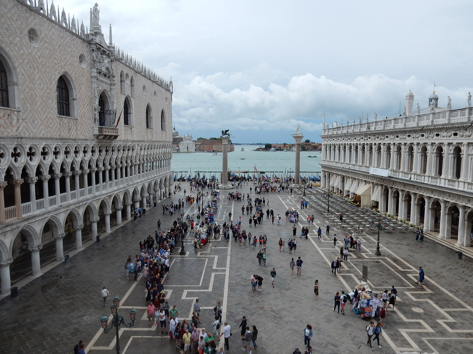 The Piazza is home to Venice's most popular tourist attractions and it's normally packed solid but we were early enough to beat the crowds so it was empty enough to let Zack chase some pigeons while we waited for our timed entry into St. Mark's Basilica (or Basilica di San Marco, if you prefer, I'm a bit inconsistent when it comes to using Italian vs. English names). We had to stow our bags first (there's a free back check) then head to the entrance for people with prepurchased tickets. Even at a relatively early hour, the line for people without tickets was already really long and it just kept getting more ridiculous as time went on. Prepurchased tickets are for specific 15 minute time slots, but we ended up at the front of the line about 10 minutes early and they let us in, so there's a little leeway there. Unfortunately, St. Mark's is the one place we visited on this entire vacation that didn't allow photos of any kind inside. The interior was very impressive though, especially in regards to the frescos that covered the walls and ceilings. That photo of the outside should give you a basic idea. Near the exit, for an extra fee, you could access the upper level which contained a small museum and gave a closer look at the frescos. It also let you go out by the horse statues on the front, which offered a great view of the piazza. I managed to hit that at a good time as well, since the line to go up had grown considerably by the time I headed down.