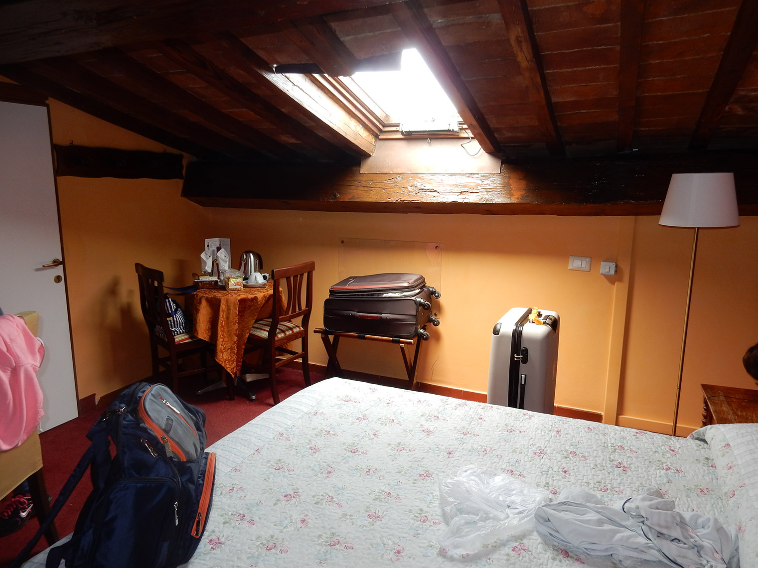 Anyway, we arrived in Florence and headed to our hotel. Going by the map, it should have been a fairly quick and easy walk. However, the map didn't account for a whole bunch of construction or all the beat up cobblestone roads we had to get the suitcases over. So it ended up taking a lot longer than I expected. But we eventually made it. Since Florence was our longest stop on the trip, I'd tried to book a fairly nice hotel. I did get a good location close to the train station and right in Florence's old city. And it was a rather fancy hotel. Though, being in the old city, it was also inside an old building. That made for kind of a neat room but, being an old building, it was built before elevators, and the hotel didn't really see the need to update that particular aspect. So getting to our room required climbing a rather ridiculous seven flights of stairs. It was also one of those hotels that was fancy enough that they try to nickle and dime you for everything. Actually, nickle and dime isn't the right phrase considering the prices... One thing they advertised was upgrades to premium rooms. Connie joked that meant rooms on the lower floors. Considering our room was the highest one, she might have been right...