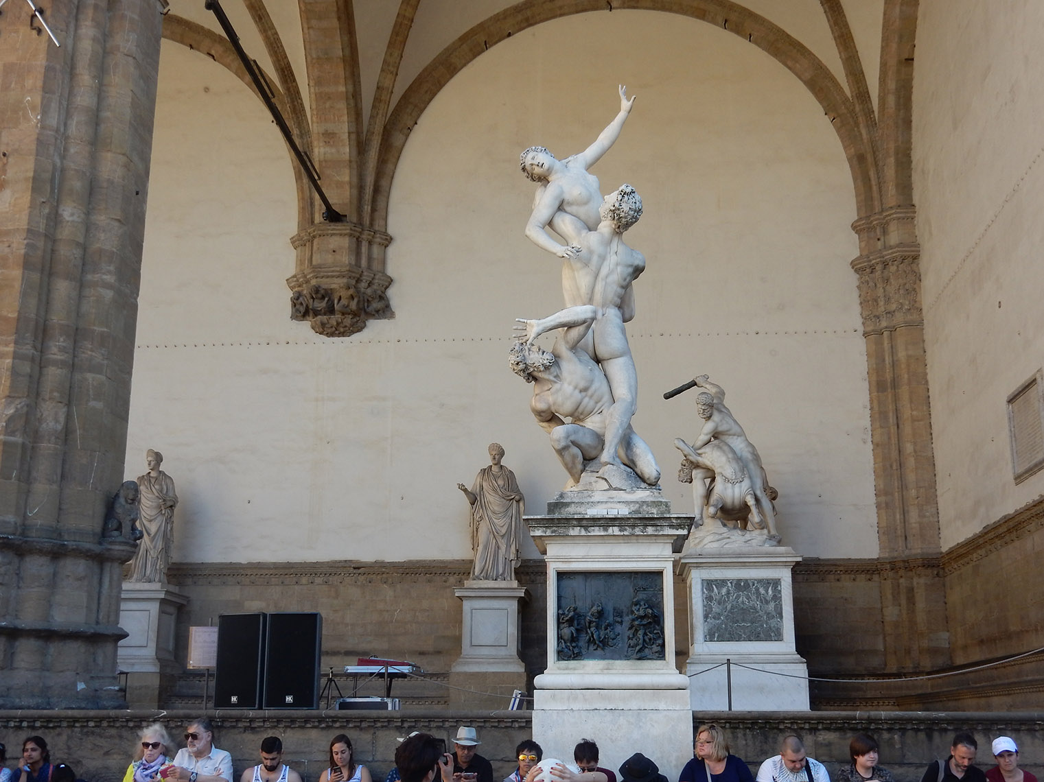 Moving on from the Duomo and its outer buildings, we had some time to kill so we walked around Florence a bit. Our first stop was actually a nearby gelato place that my tour book recommended. I usually don't pay too much attention to restaurants in my books, but when it mentioned organic gelato, I figured it was worth a try and yeah, it was good. Gelato aside, we wandered around for a while and ended up at the Palazzo Vecchio. In addition to the fortress, the attached piazza holds a lot of famous statues, including Micheangelo's David... Or at least it used to. At least most of the statues there now are copies, with the originals relocated to better preserve them. It's still a cool spot, but the imitations lack some of the detail and splendor of their originals. There's a famous fountain in the area as well but, unfortunately, it was undergoing restoration so we weren't able to see it.