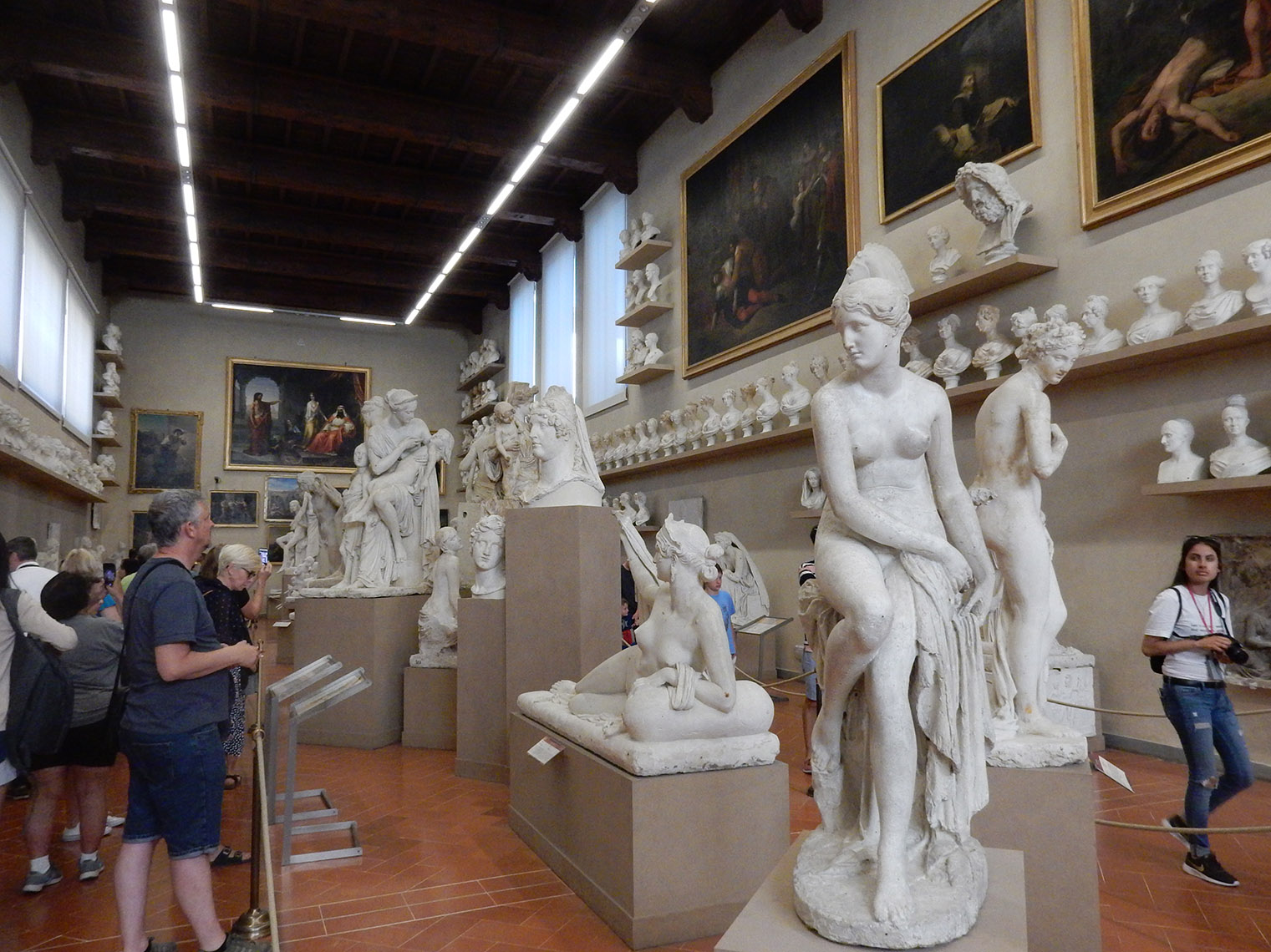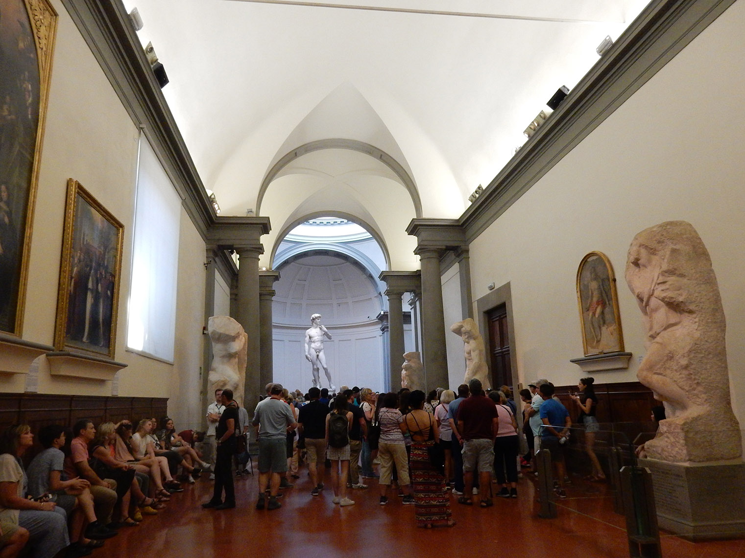 Following the advice in my travel guide, I'd booked some tickets for today in advance. They were time stamped, which was a bit inconvenient, but very much worth it considering the lines. So, after breakfast, Connie, Zack, and I headed to Galleria dell'Accademia. Ignoring the long lines, we swung by the nearby ticket office to trade my voucher for our actual tickets and then headed inside. The Galleria is, as the name implies, an art gallery. There's some statues and paintings, but pretty much everyone goes there to see one thing, Michelangelo's David. Got to say, the real thing is pretty impressive, and the replacement we saw the previous say in the piazza just doesn't compare. Other than David, Connie and I found the plaster cast collection pretty impressive. There's also a smaller upper level, that almost no one visits, which has a nice collection of Gothic painting (though I'm still not a fan of the style). In the end, while the Galleria was worth visiting, it really didn't take that long to see.