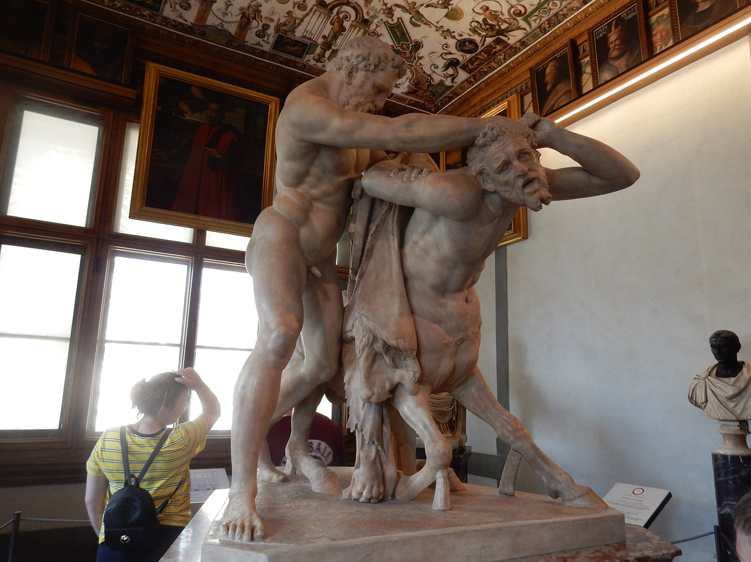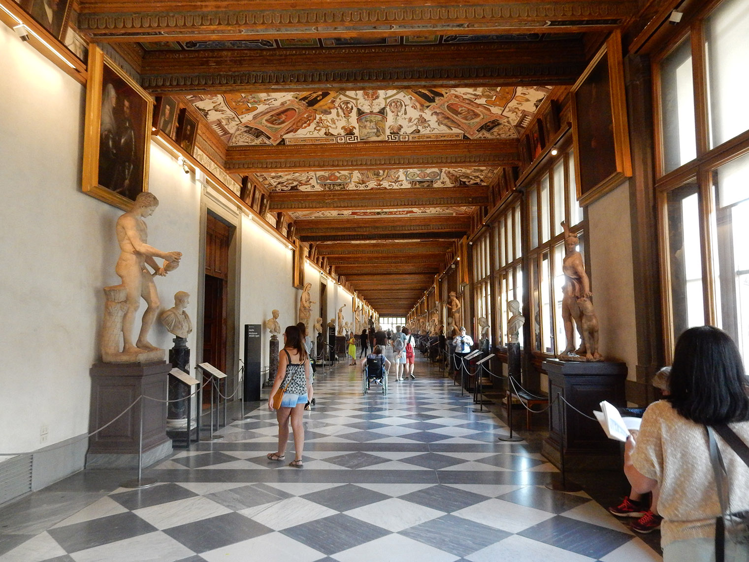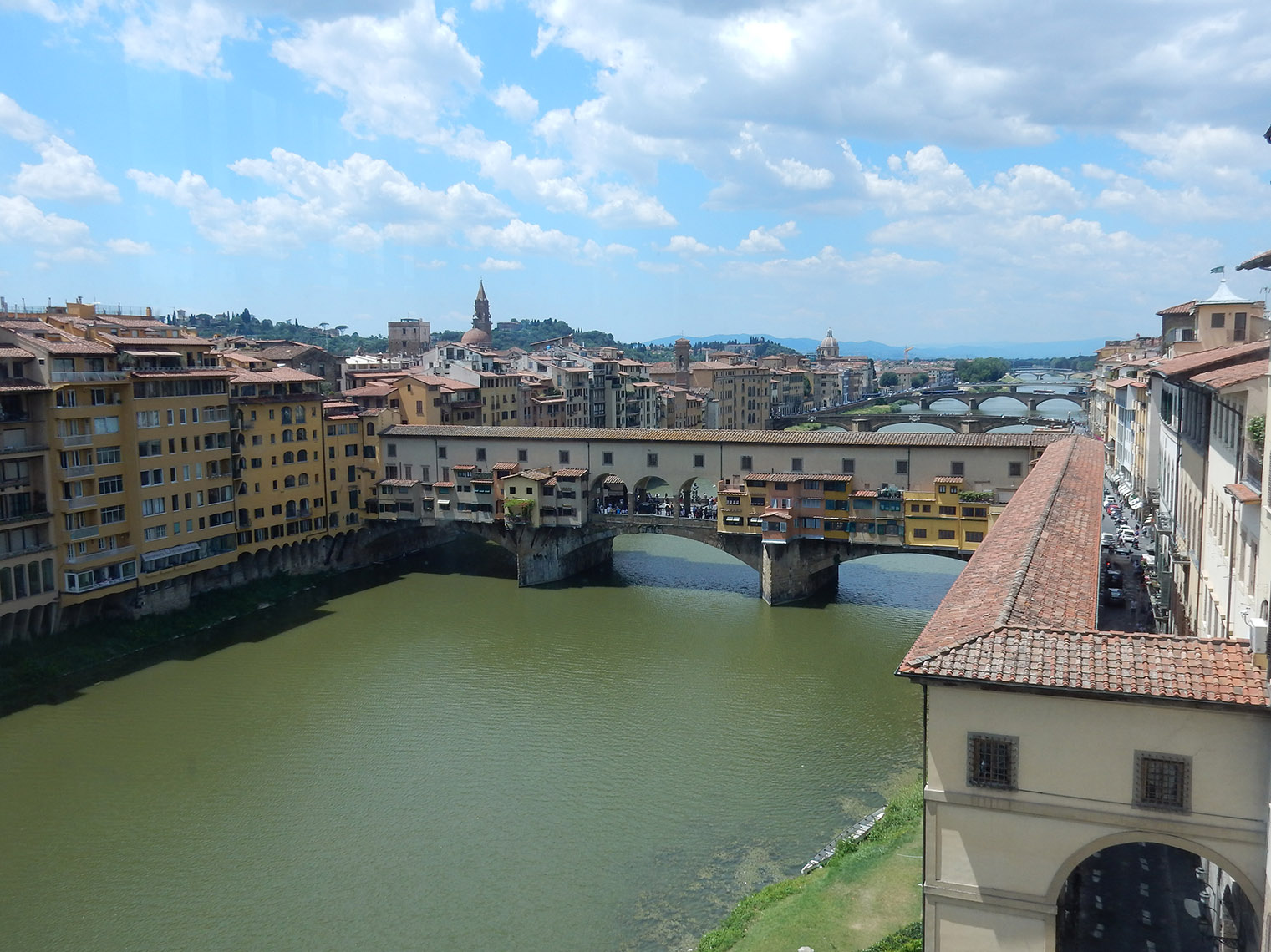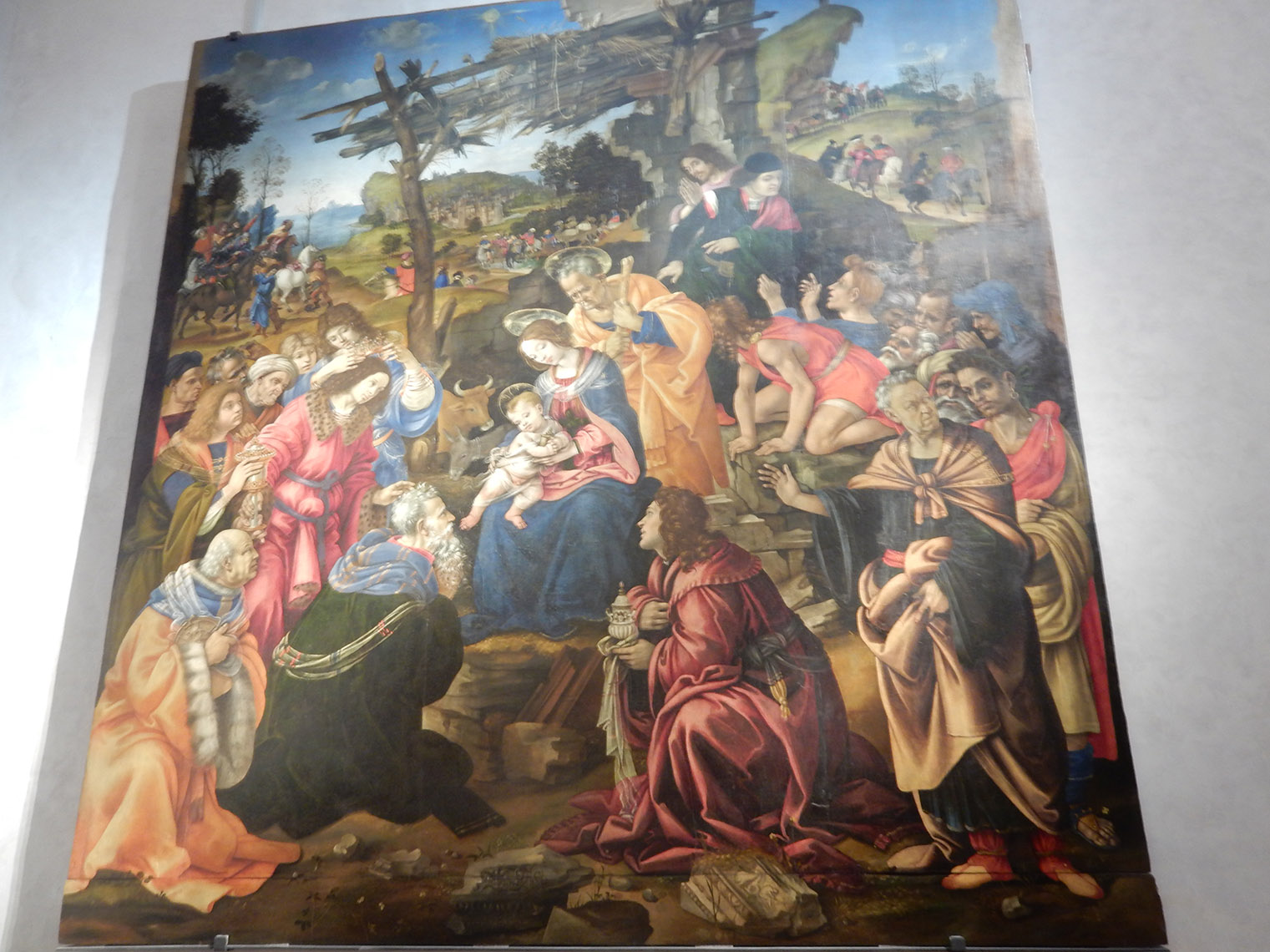 After lunch, it was about time to enter the Uffizi, which is the city's most popular art gallery. It's comprised of a large number of rooms, connected by long statue lines hallways. While I'm not a major art buff, I've visited a decent number of galleries and museums over the years and I'd say the Uffizi is easily in the top three. It's also pretty large, and took Connie and I over two hours to get through, even going at a pretty decent pace. Other than one special exhibit, the entire collection is comprised of classic works of art, mostly Gothic and Renaissance. To avoid a picture overload, I'll just post a few highlights like this statue of Hercules and Nessus, the original Birth of Venus, and the Adoration of the Magi (started by Da Vinci, but completed by Lippi when the client got tired of waiting). And, for a break from the art, there were also some nice view points where we could see the Ponte Vecchio and Palazzo Vecchio.