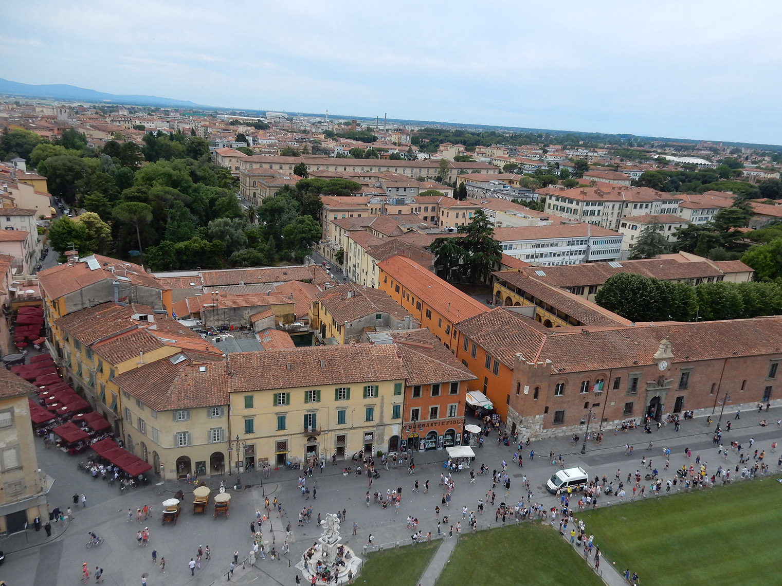 Unlike the other towers I'd climbed, the Leaning Tower had a really strict no bag policy, to the point where they wouldn't even let me wear the empty Ergobaby. Fortunately, they did have a free bag check, though you had to go there no more than ten minutes before your time slot, which means some running back and forth. Why was the Ergo empty? Because children under six years old aren't allowed. A little annoying, but it was nice not to have to carry so much extra weight on the way up. Climbing the tower was relatively easy, certainly less strenuous than any of the others, though a little disorienting due to the tilt. It wasn't super obvious once you were inside, but it did cause the stairs to ascend at odd angles. It didn't help that they were very worn and slick. The views from the top were nice, though I had trouble deciding if I should hold my camera flat (like I was standing), or turn it to match the tilt of the tower.