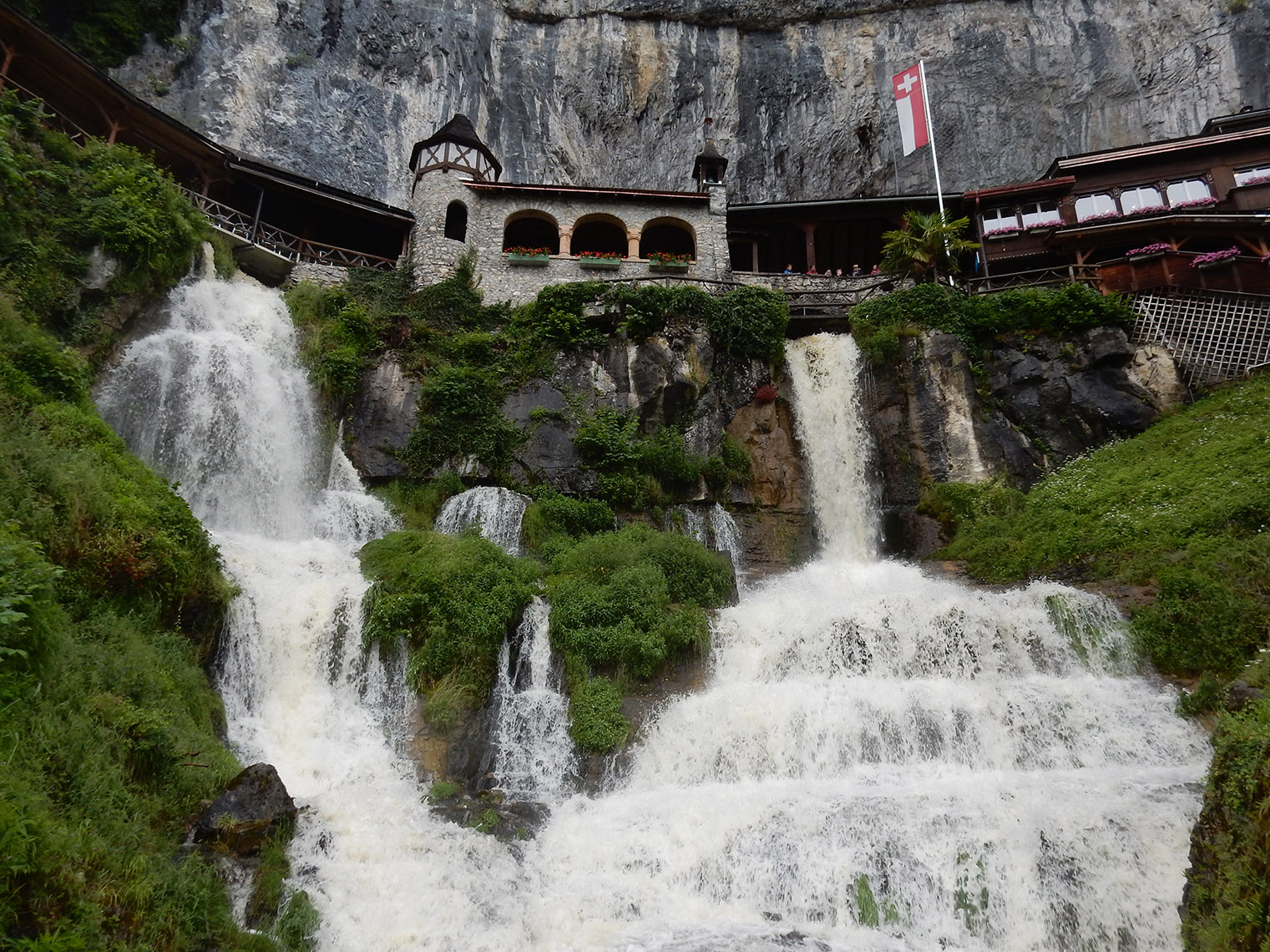 The city of Interlaken (the biggest city in this part of Switzerland) is so named because it sits right in the middle of two lakes, Lake Thun and Lake Brienz. Since the weather was still iffy, we headed to Interlaken then hopped on a bus heading along the coast of Lake Thun. Our destination, the St. Beatus Caves. As a note, the caves are reachable by bus and ferry, but the bus is a lot faster. The train does go around Lake Thun too, but only on the other side, so it can't get you to the caves.