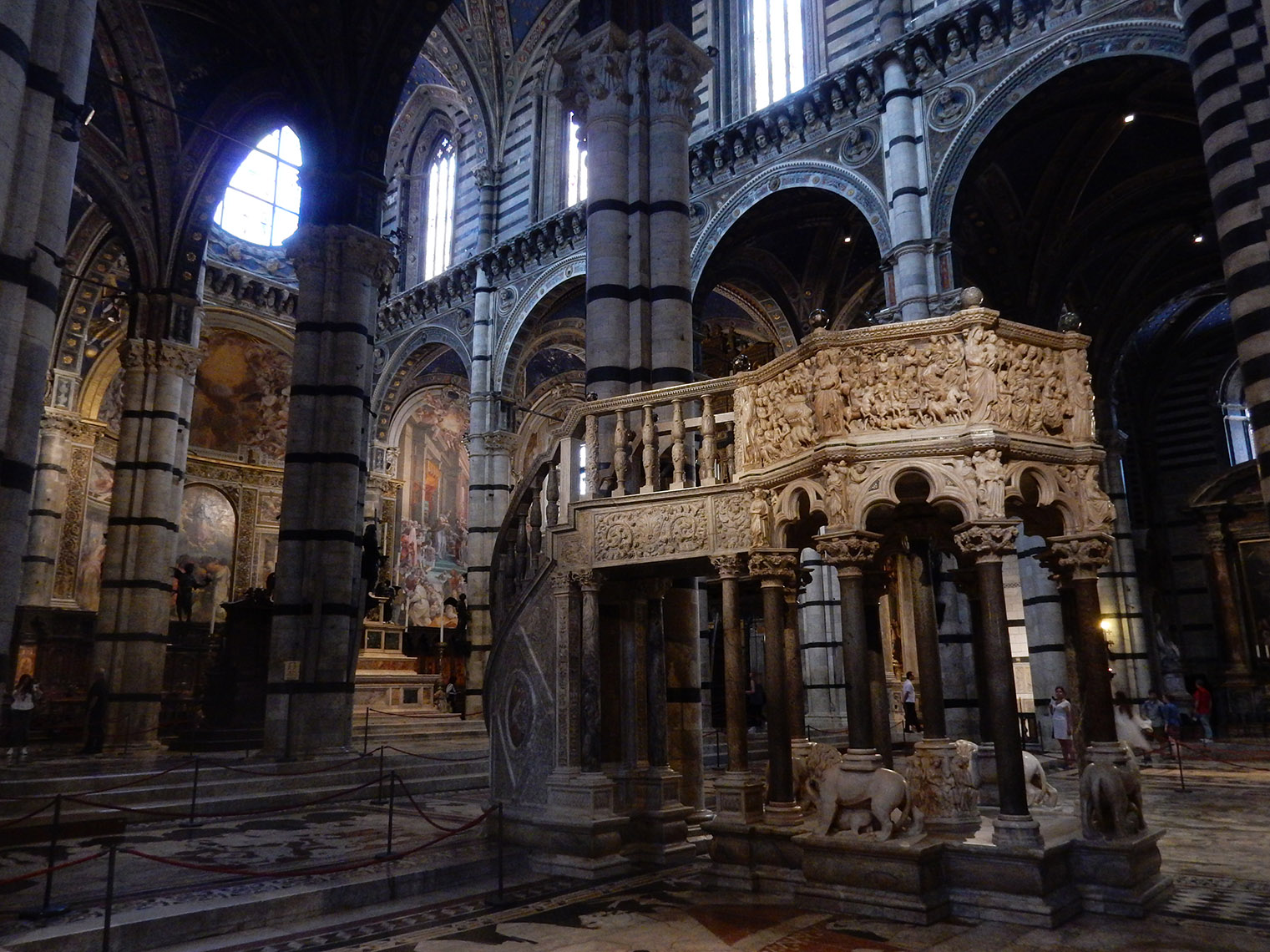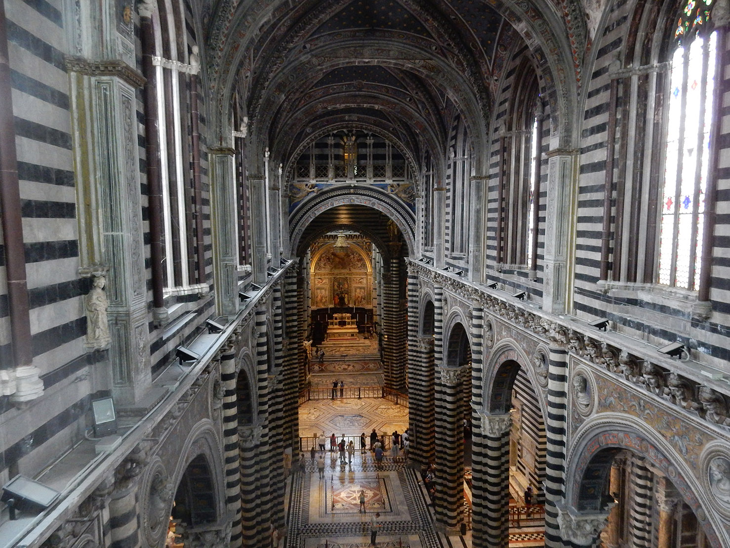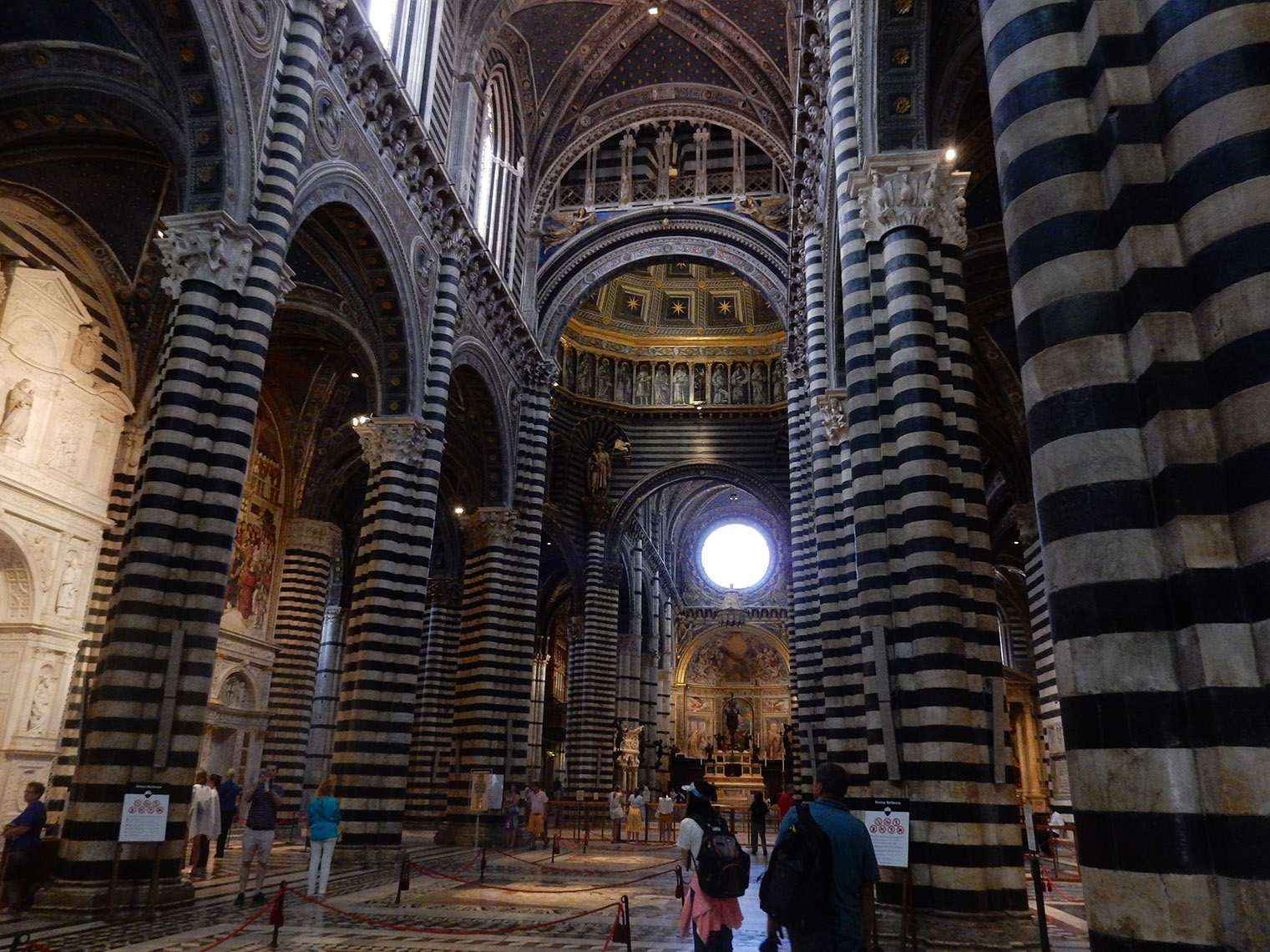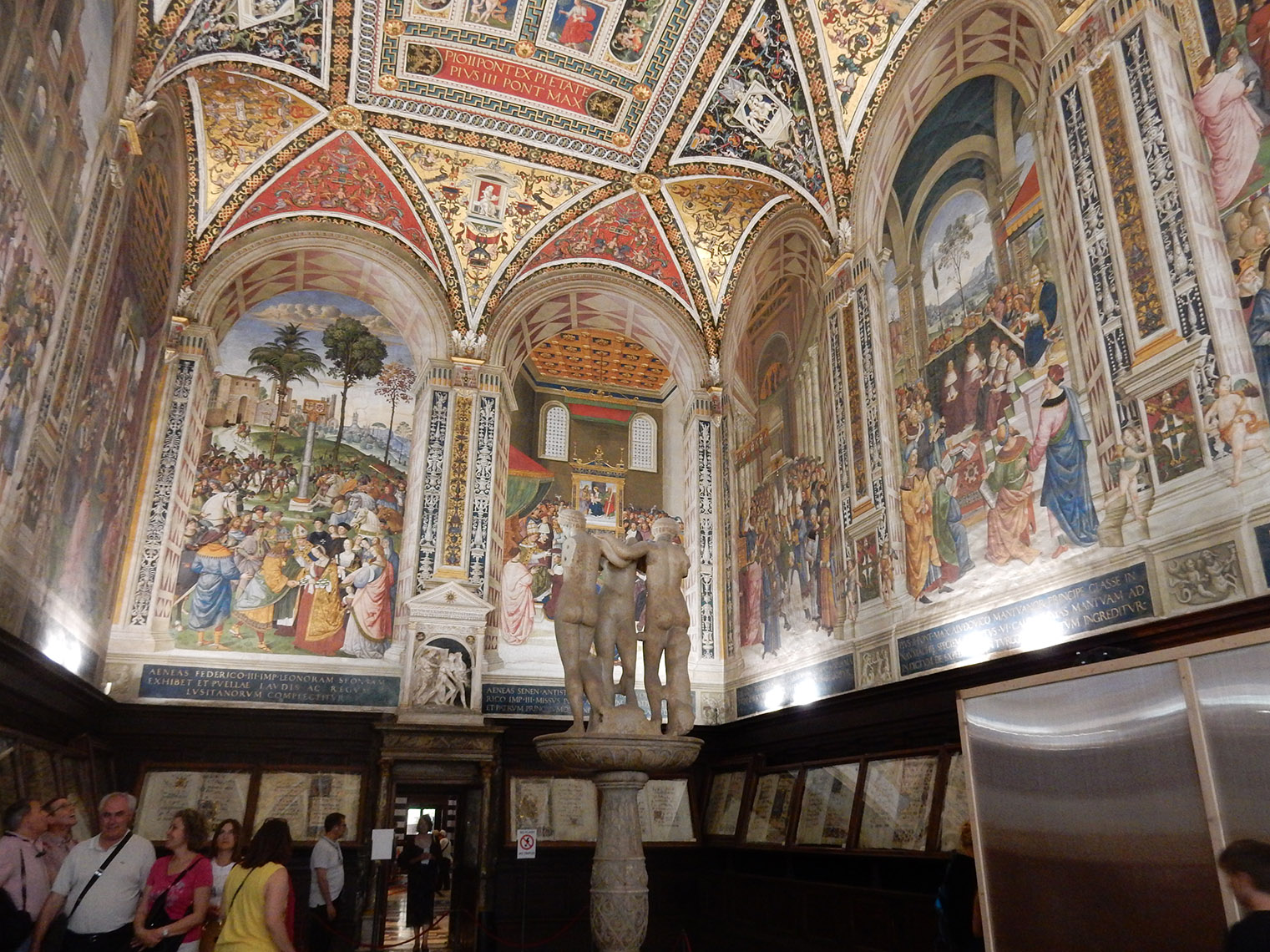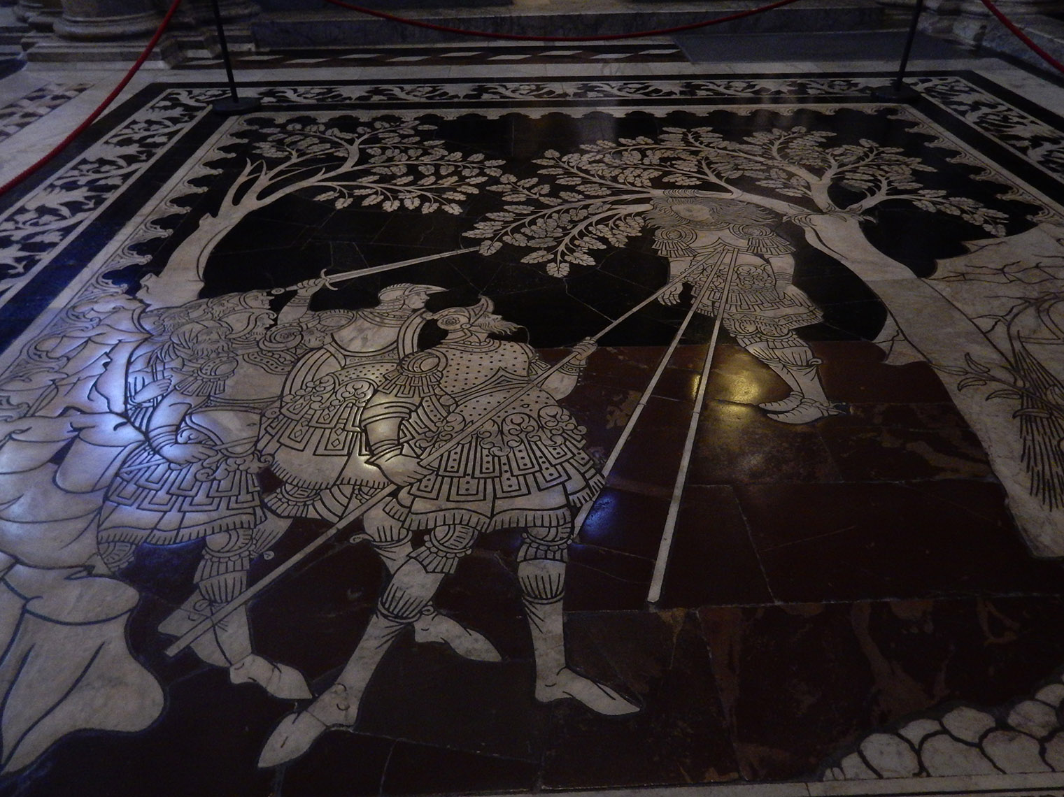 Right across the street from Santa Maria is Siena's Duomo. I grabbed combo tickets for everything without paying too much attention to the details. Turns out one thing on the ticket had a timed entry but we had some time to kill before that, so we headed inside. While smaller than many of the Duomos we'd visited, Siena's was very unique in a number of ways. The zebra striping on the walls and pillars immediately jumped out. But another interesting element was that, aside from the impressive paintings and architecture, the floor was covered with a large number of designs. Some seemed purely artistic, but the majority were of different scenes from the Bible. The choice of subject matter was pretty unusual though. I suppose Moses with the ten commandments is pretty iconic, if slightly odd for a Catholic church. But Sampson using the donkey's jawbone? Or Absalom getting caught in a tree? Now that's a story that rarely gets any sort of artistic depiction... The library (in a side room) was also worth a visit due to the art and collection of illuminated books.