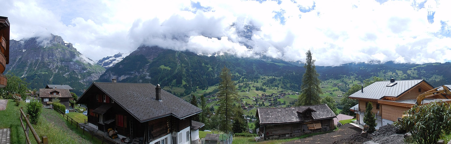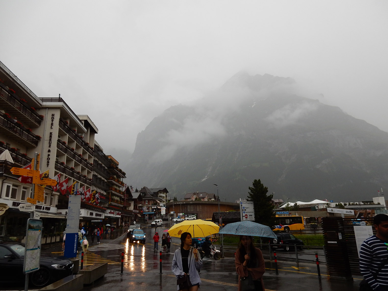Everything went really quickly and smoothly and before long we were on the first of several trains heading towards our destination. The scenery leaving Zurich wasn't all that great, but started to improve as we neared the town of Bern, where we stopped to eat lunch and change trains. Speaking of lunch, the train station had a pretty nice food court and, like much of Europe, Switzerland has awesome bread. After Bern the scenery started to get really nice. I would have liked to take a few pictures out the windows, but I spent most of the train ride trying to keep Zack happy. Anyway, he finally took a nap and we made it to Interlaken (so named because it sits right inbetween two large lakes), where we switched trains one more time for a relatively short ride to the mountain town of Grindelwald. Unfortunately, the weather was not on our side and it was raining pretty hard.