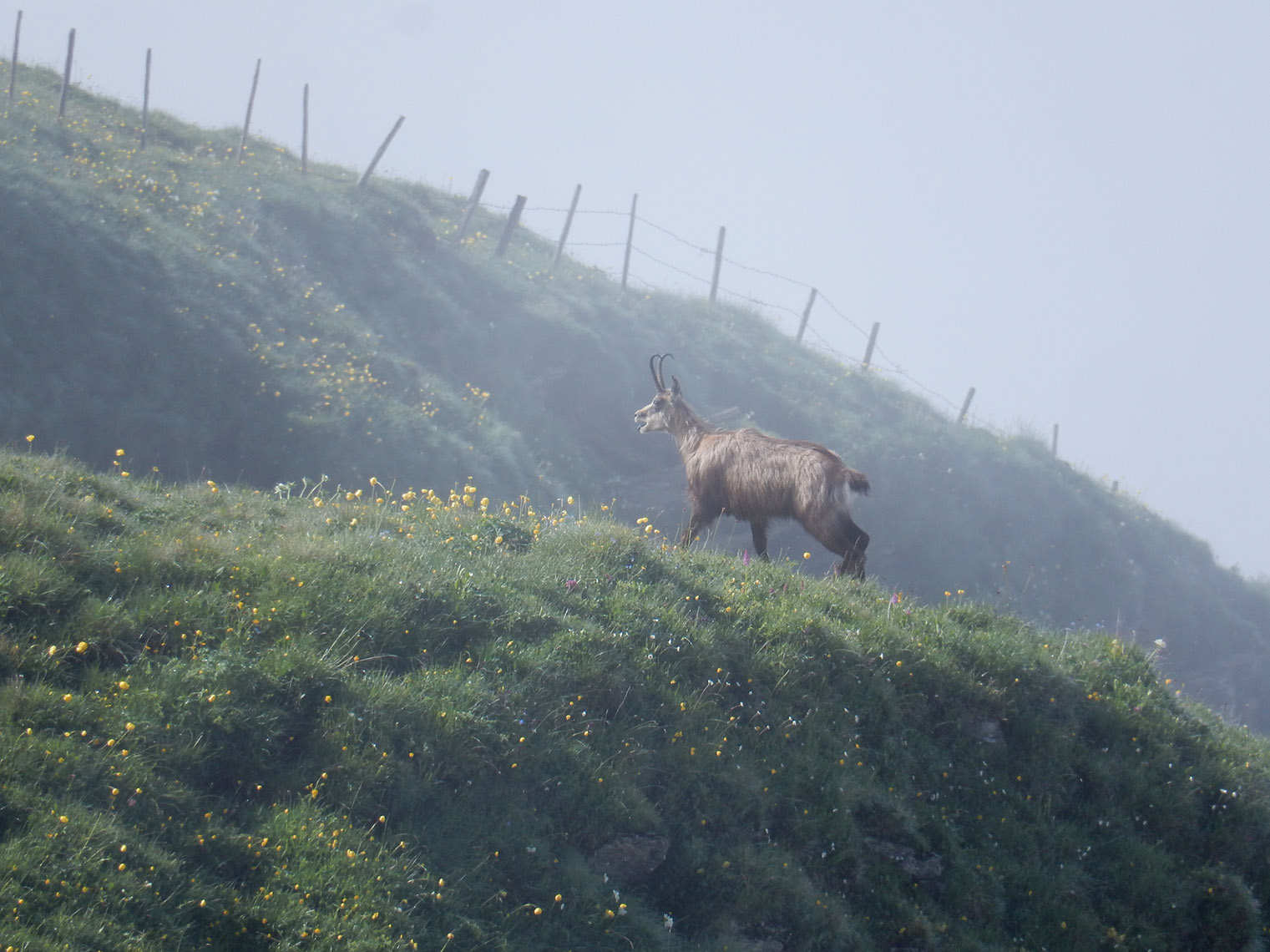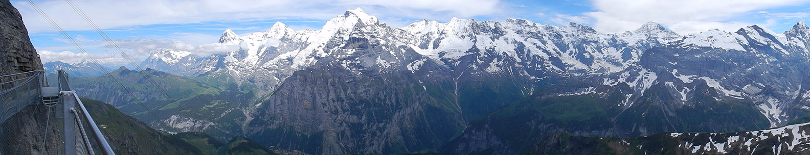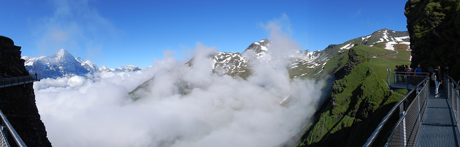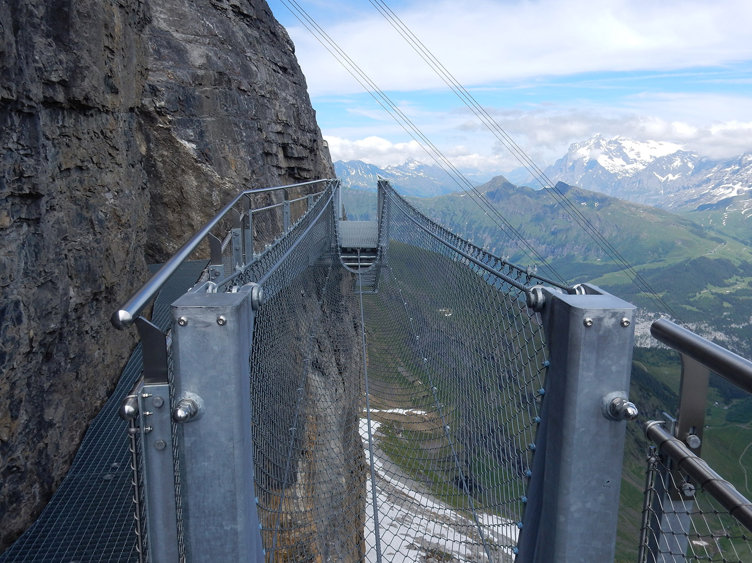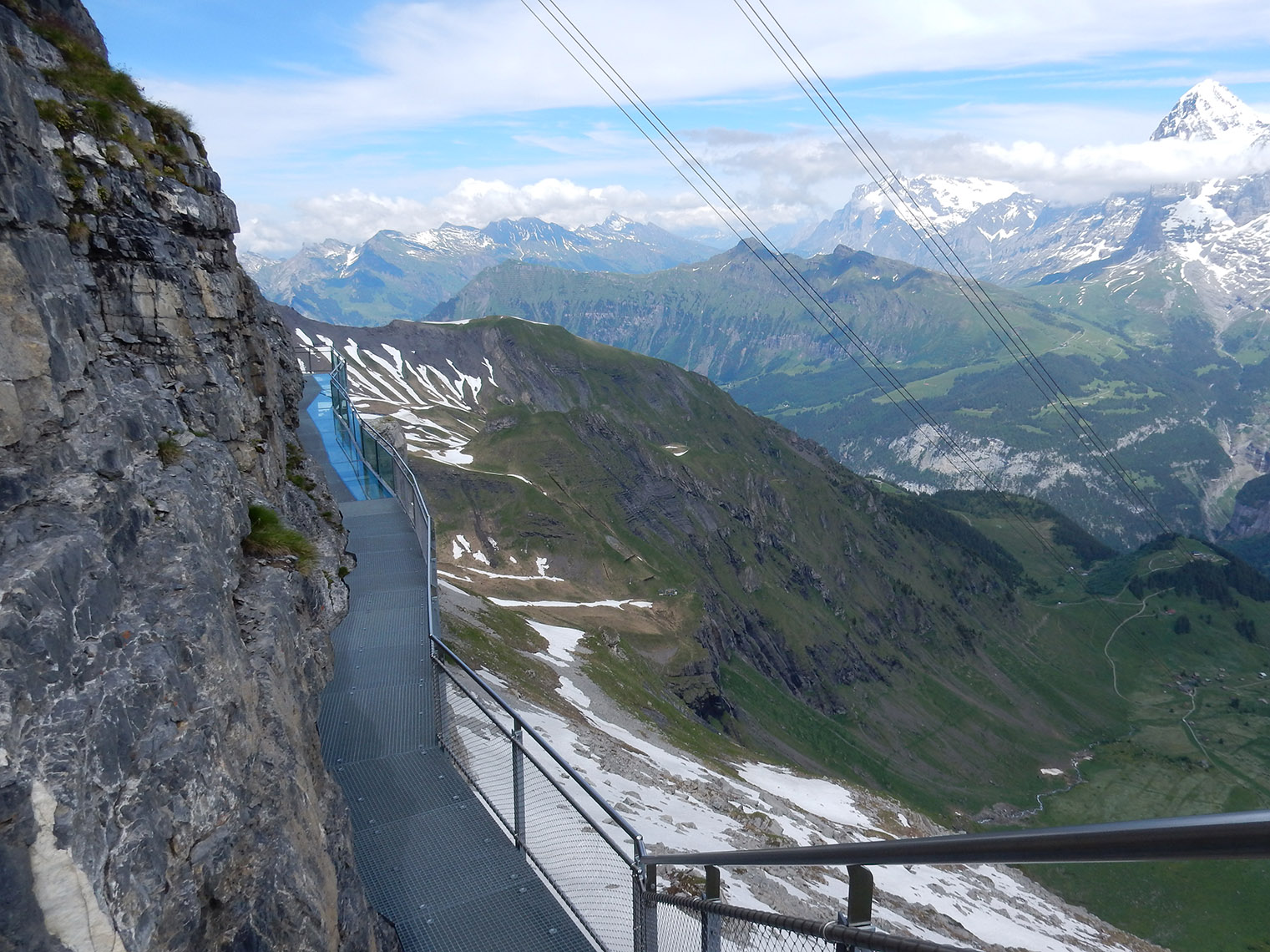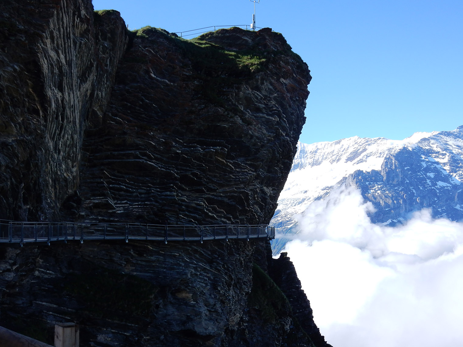 After a few days of cloudy and sometimes rainy weather, the skies were finally clear so it was time for some hiking. We started by walking to the far end of Grindelwald and taking a ride on the Grindelwald First cable car (a different cable car than the one we rode a couple days back; First is the name of the mountain, BTW). It's a pretty long cable car, with a couple of stops along the way, and a number of activities as well. Our goal was the hike to Lake Bachalpsee, but we got sidetracked at the top by the First Cliff Walk. I've seen walks like this before on the internet and on TV, but this was my first time seeing one in-person and it was really cool and offered spectacular views. I even spotted some mountain goats off in the distance.