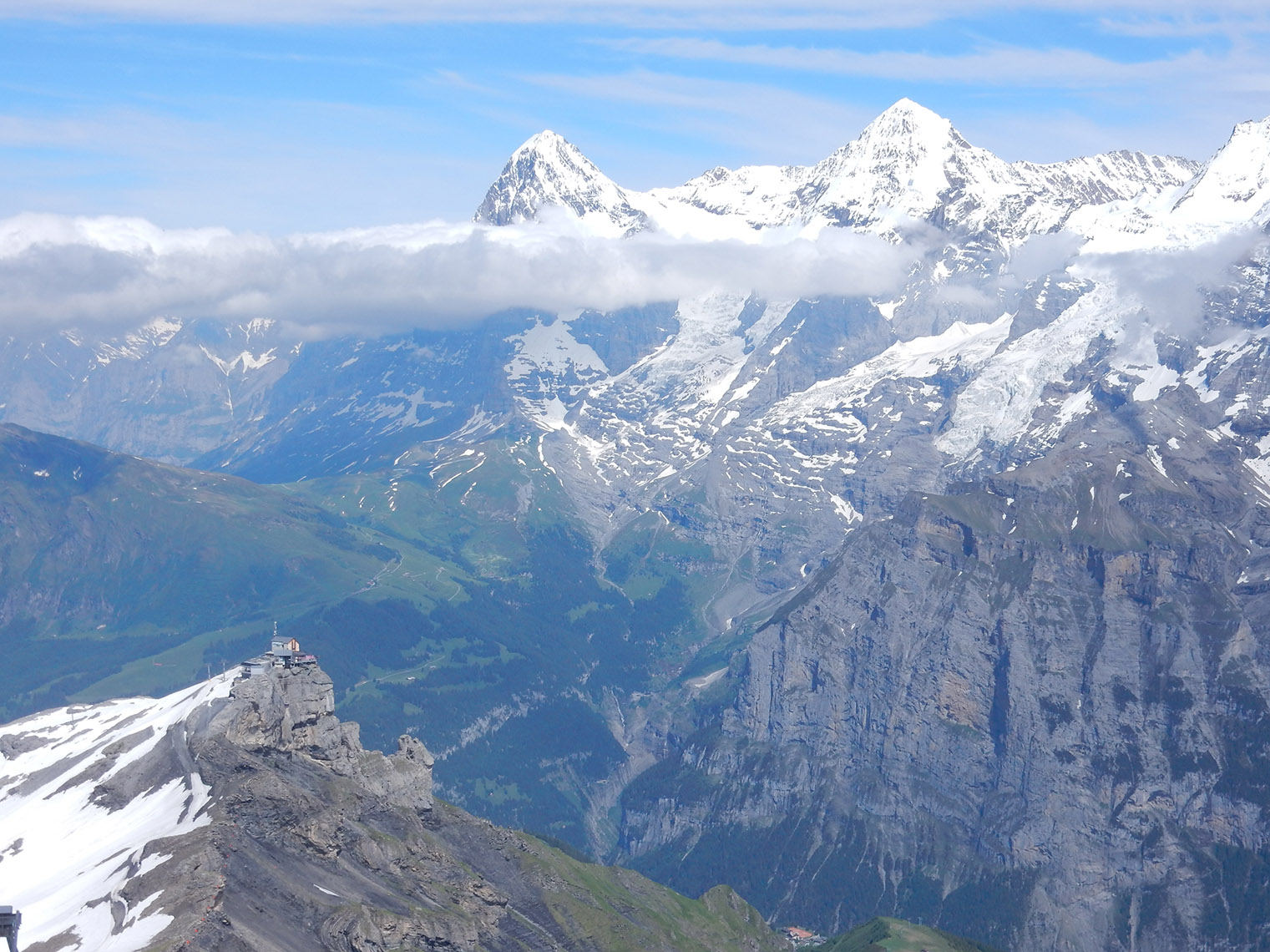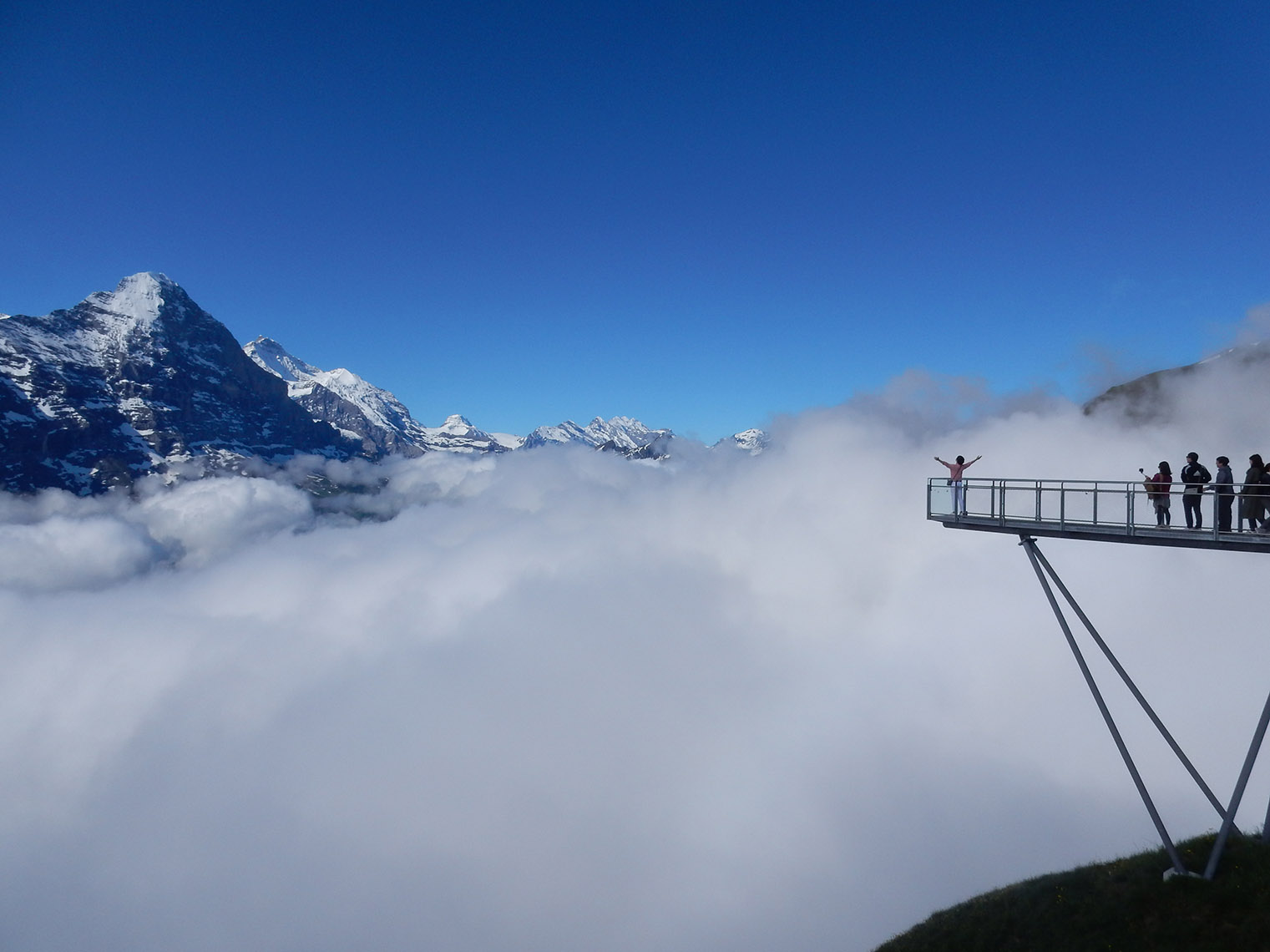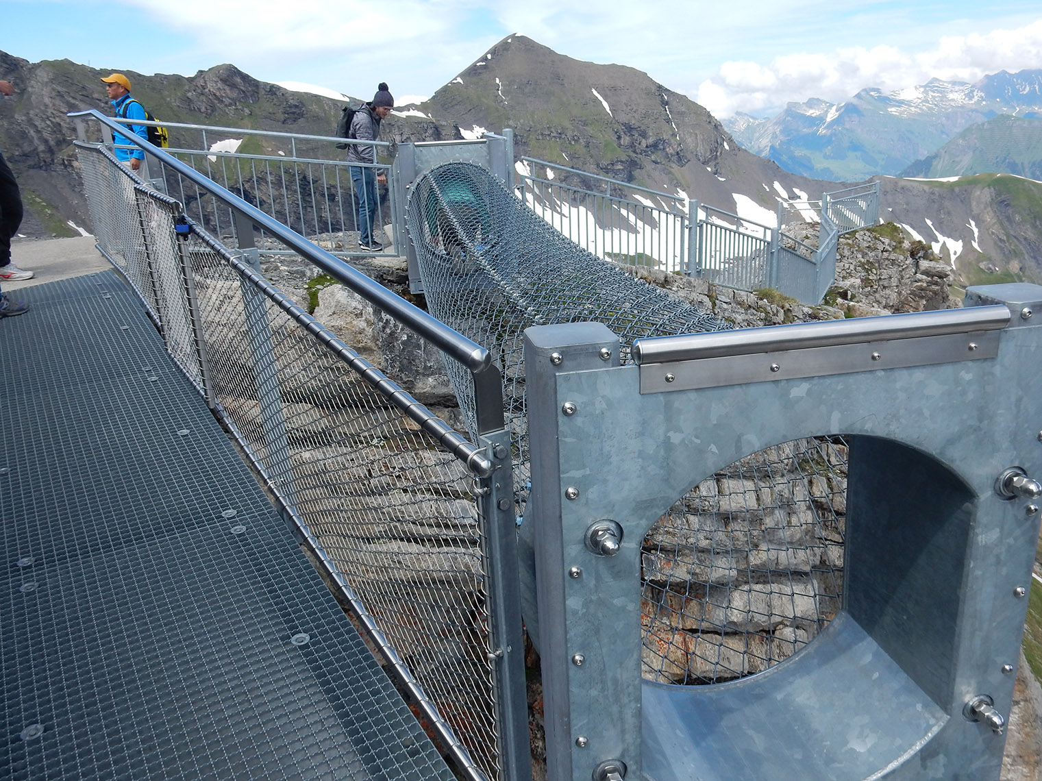 Anyway, the first cable car goes up to a stop named Brig. You could just hop right on the next one to Piz Gloria, but that'd be a mistake. In addition to awesome views, Brig has the thrill walk, which is a cliff walk kind of like the one on Grindelwald First, but better. Now there isn't much that scares me, especially heights, but the thrill walk was so high it made even me a little nervous. It also had some fun additions like a glass floor section, an optional cable walk, and a chain link tube you could crawl through. I walked on the glass floor and across the cable but, unfortunately, I was carrying a sleeping Zack at the time, so I had to skip the tube. Still, the whole thing was utterly breathtaking and so worth it.