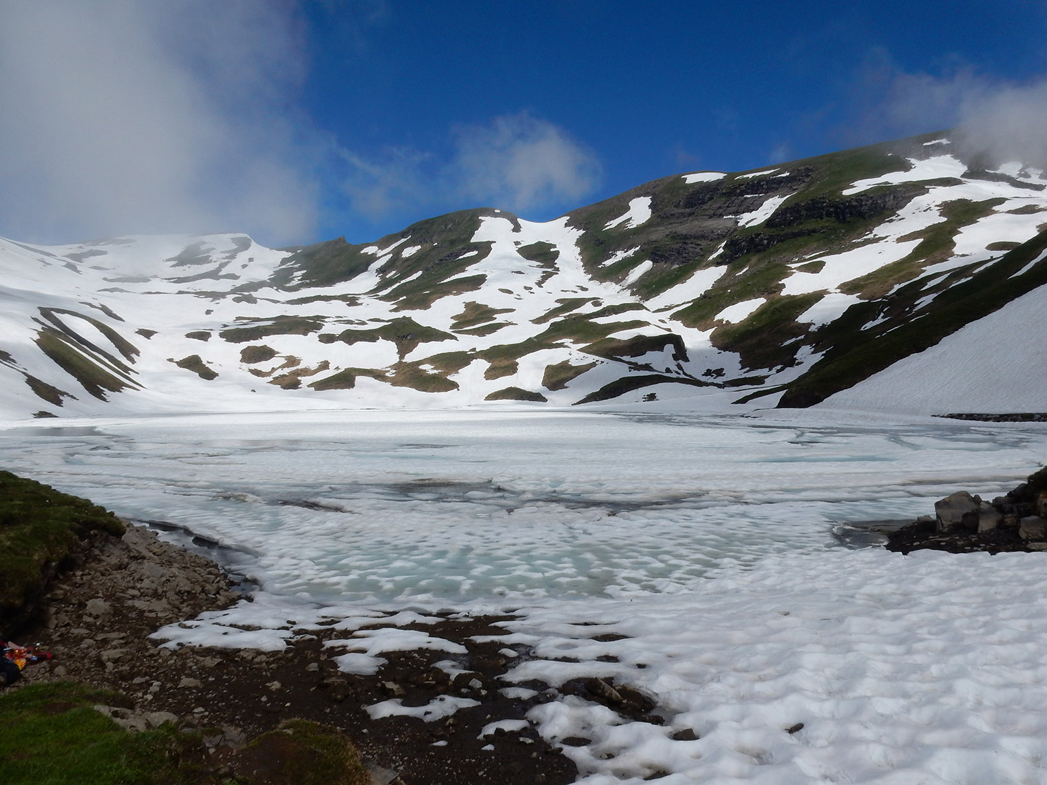 After finishing the walk and admiring the views for a bit, we finally started on the hike itself. There was a decent ascent at first, though the trail leveled out a lot after that. We decided to let Zack walk a bit to burn up some energy, and he really enjoyed that. After some ups and downs and a lot of snow spotted mountain meadows, we reach the lake. The really interesting part was that the lake was divided in half and while one half looked normal, the other was frozen over, creating an odd contrast.