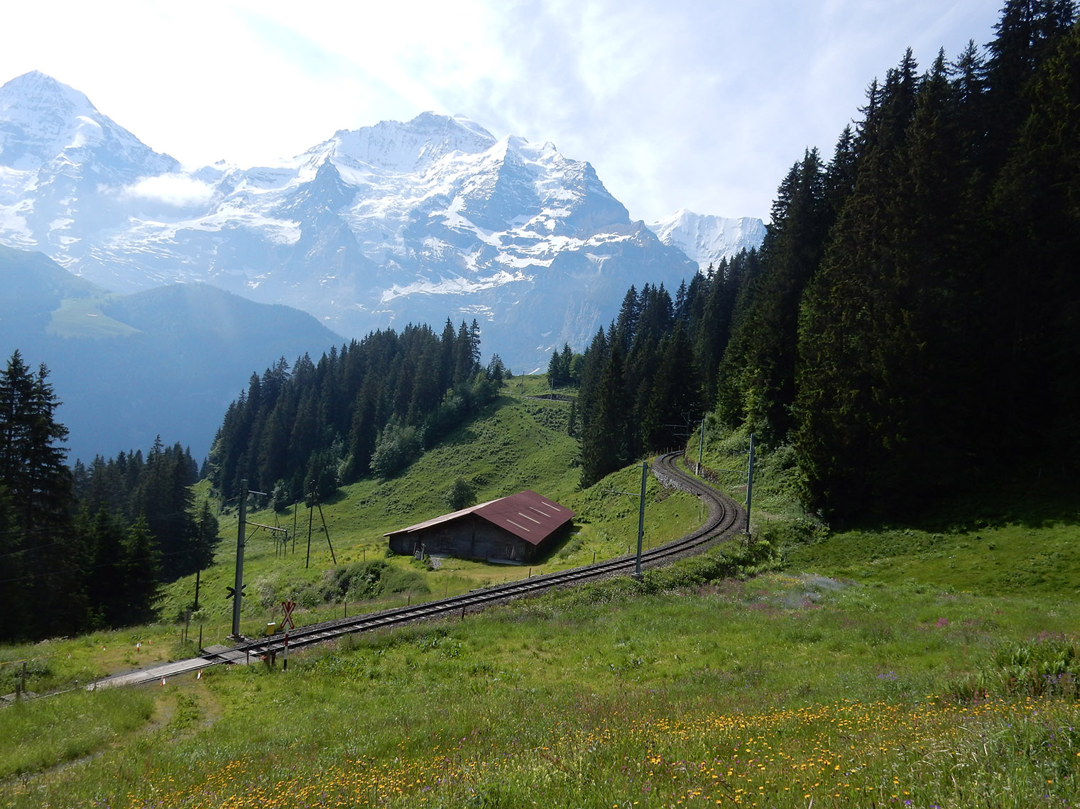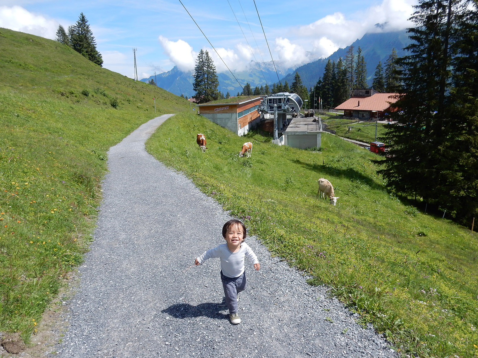 We set off on a pretty path that more or less followed the railroad tracks through flowery meadows, small forests, and groups of happy cows. It was a pretty easy hike with some great views. About half way, we came across a little roadside shop where one of the local farmers was selling milk, yogurt, and cheese (on the honor system) from the cows on that very mountain. The yogurt was awesome, and you don't often get the chance to get it so fresh. Just after that was a restaurant with a nice playground and indoor play room, which the kids really enjoyed. Eventually though, we needed to keep moving to reach our destination, the town of Murren.