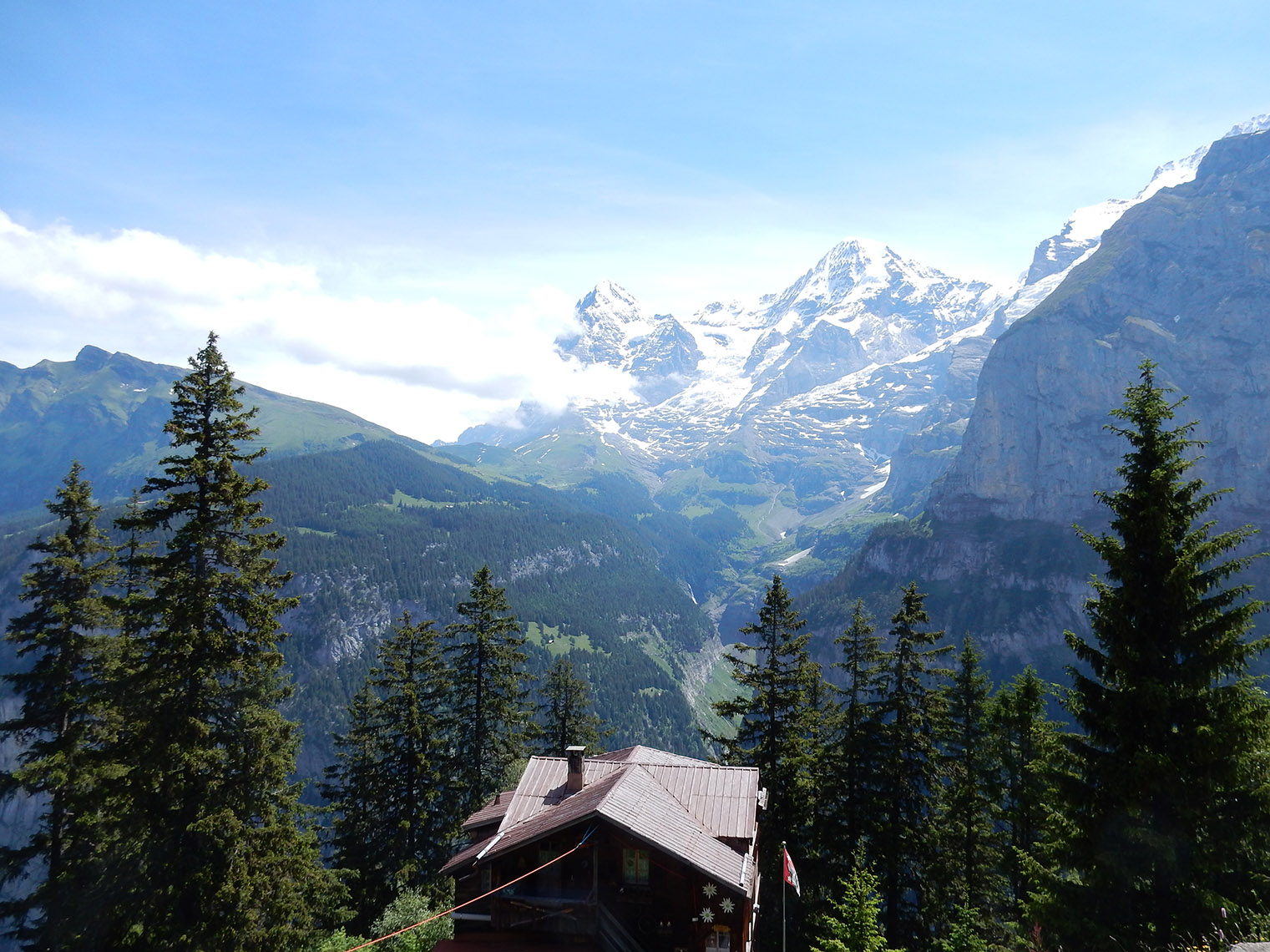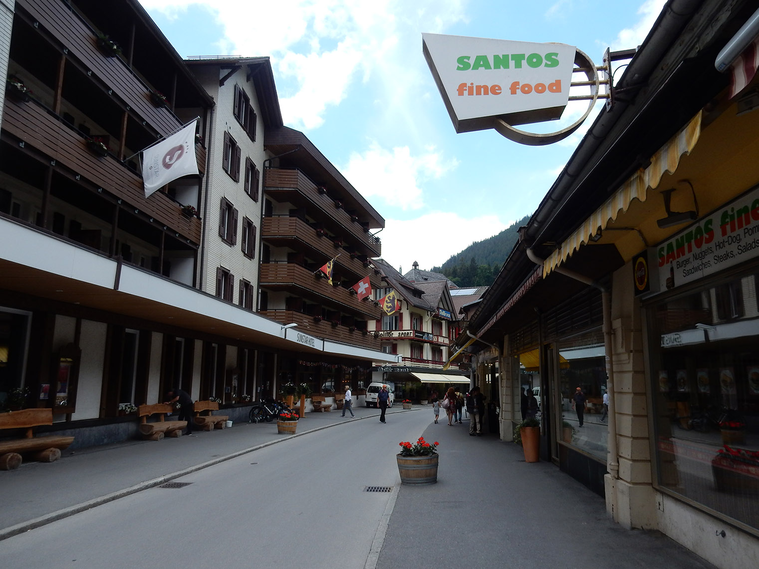 Murren is a small town high up on the mountain that doesn't allow any cars (other than a few services vehicles and such) so the only way to get there is via cable car and then train or hiking. Despite the remote location, it's popular with tourists and actually has a number of rentals and hotels. It's a pleasant place and the views are spectacular. We had been making good time, and stopped at a nice cafe for a drink and a snack before walking around the town a bit.