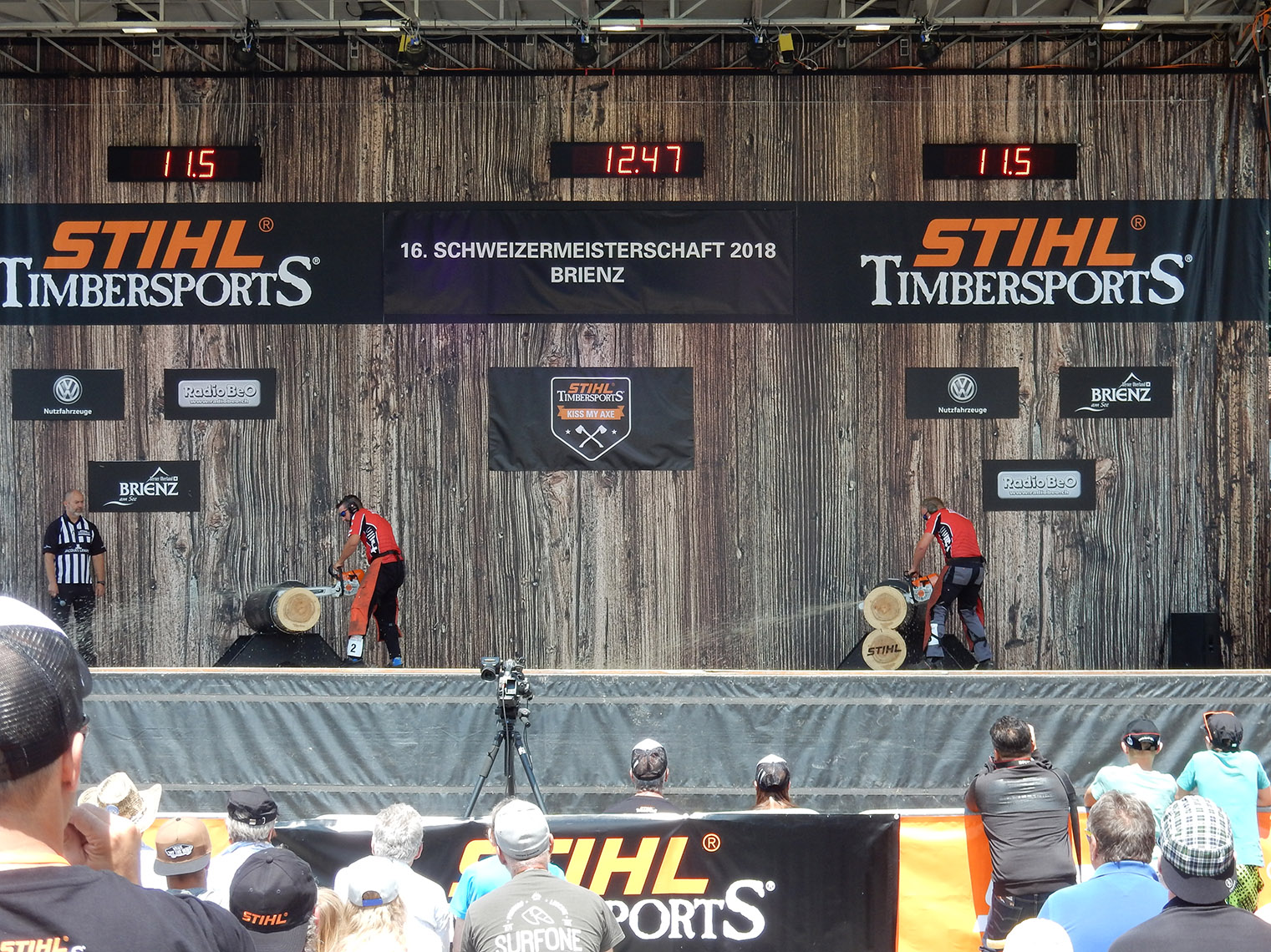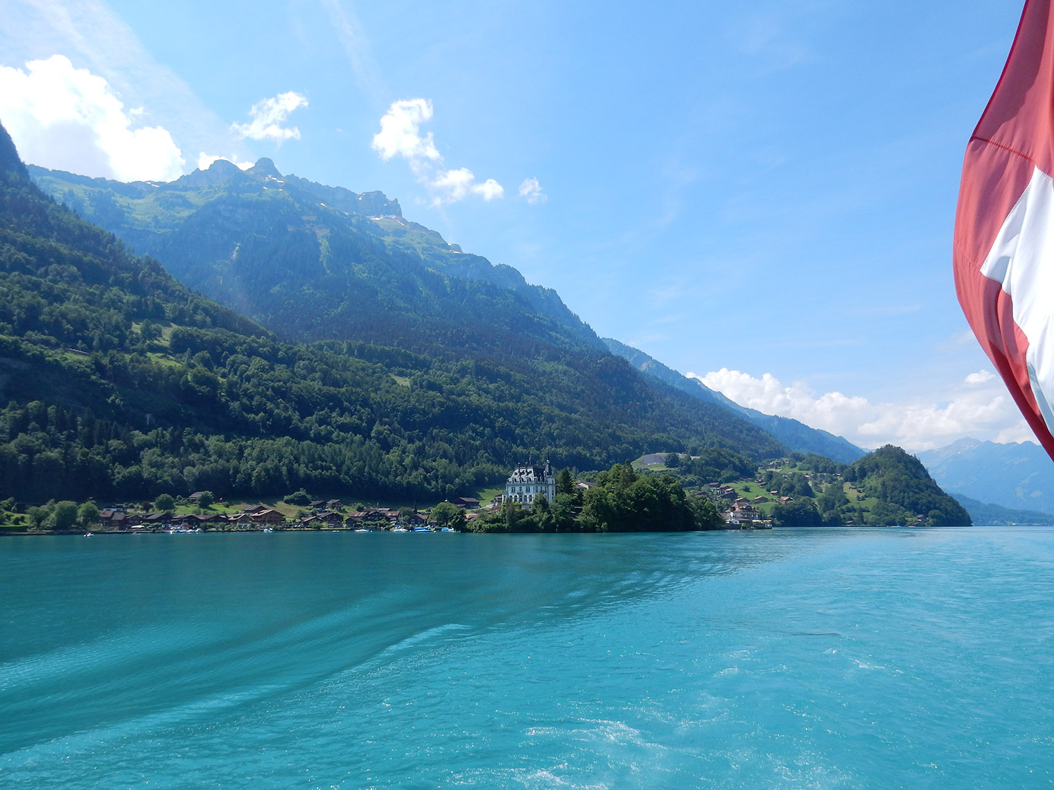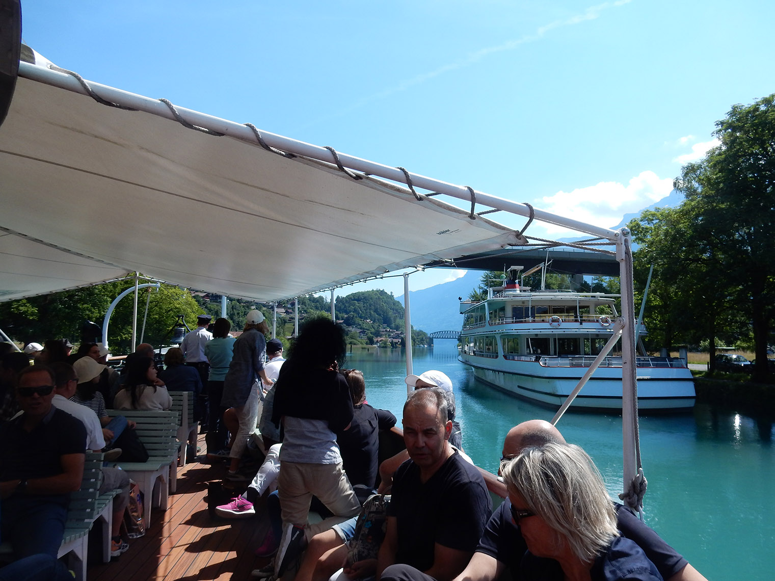 Now, I mentioned before that Interlaken is situated inbetween two lakes. We explored a bit on and around Lake Thun a few days back, so today we decided to go and take a boat across Lake Brienz. The landing was right outside of the train station and soon we were off. It ended up being a smaller and older ferry than the one we had the other day. Not that there was anything wrong with it, just a bit more crowded and without as many amenities. Lake Brienz seems to be a bit smaller than Lake Thun, and has fewer stops, so it's a quicker ride, but there are still plenty of great views and it was a nice relaxing trip. The ride ended in the town of Brienz. It seemed like a pleasant little place, especially how they had stations with free to borrow canvas chairs all along the coast for people to use. But when we were there it was in the midst of the STIHL Timbersports competition so they had a bunch of tents up selling stuff related to logging and some related events like seeing how fast contestants could saw through a log. The problem with a chainsaw competition, by the way, is that it takes around five minutes of setup for each match, which then lasts around 12 seconds. We walked along the coast a bit, watched the sawing a little, then decided to get the next boat back. It ended up being one of the big boats just like the one we road on Lake Thun, which was nice since we were able to let Zack and Isaac play in the kids' area the whole way. Got some different views too, including this very old and famous hotel, which is reached by an old and famous ropeway.