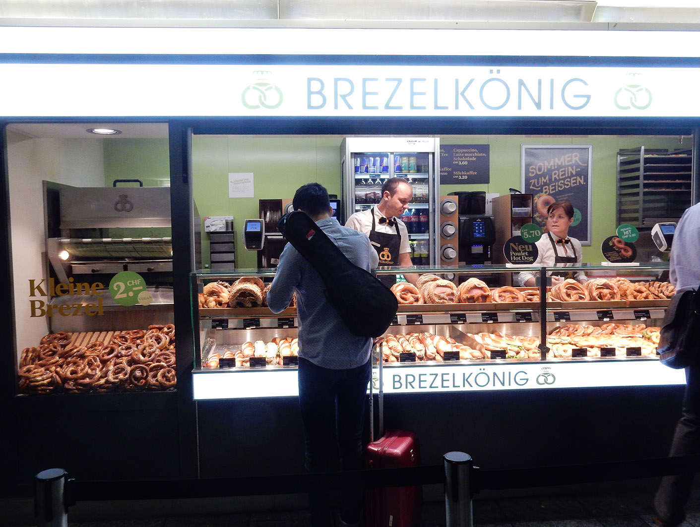 Connie and I had changed trains and gotten lunch in Bern on our way to Grindelwald, but we were only on a corner of the upper platforms and didn't realize how large the station was. It's a pretty big and fancy one, with lots of shops and restaurants. I especially have to call out this place (a chain) for their awesome pretzels.