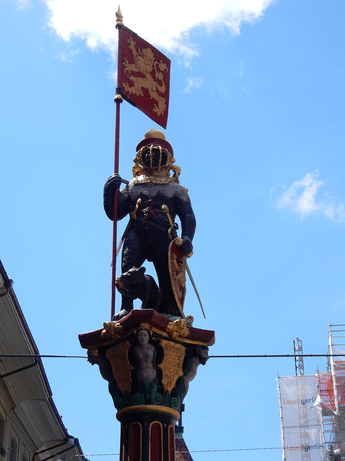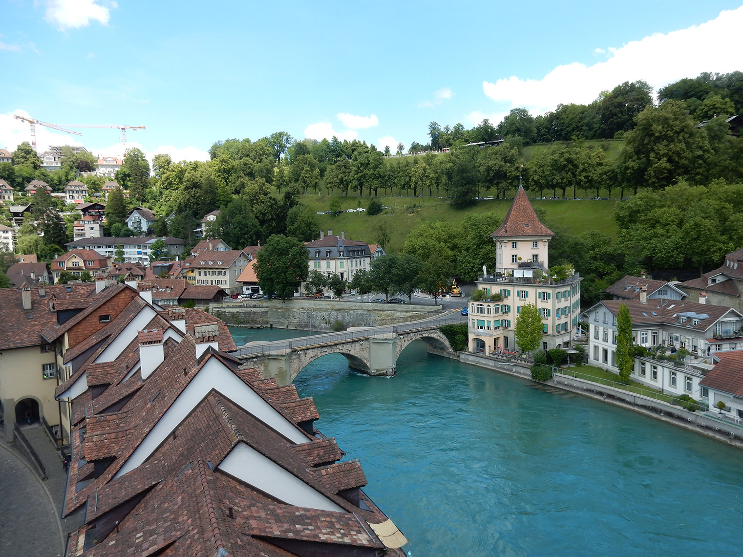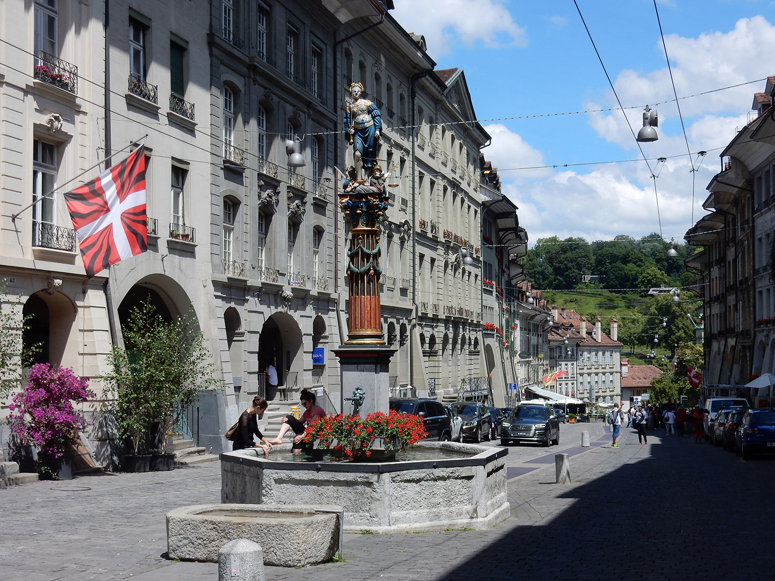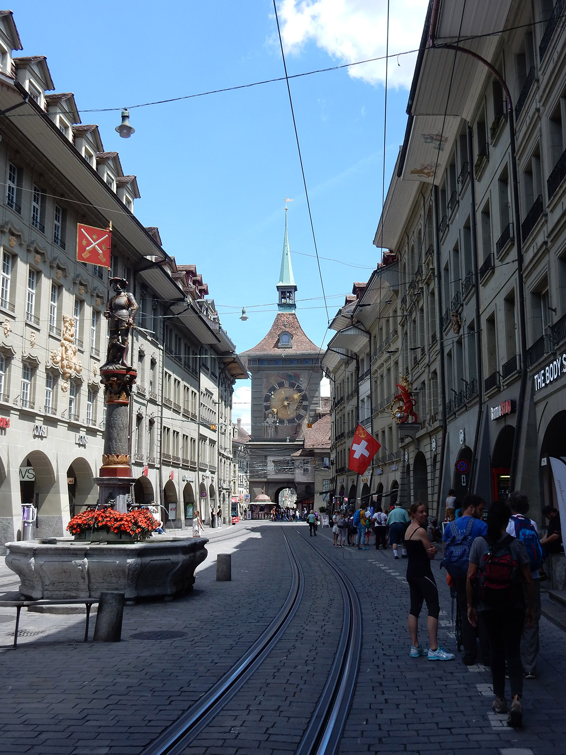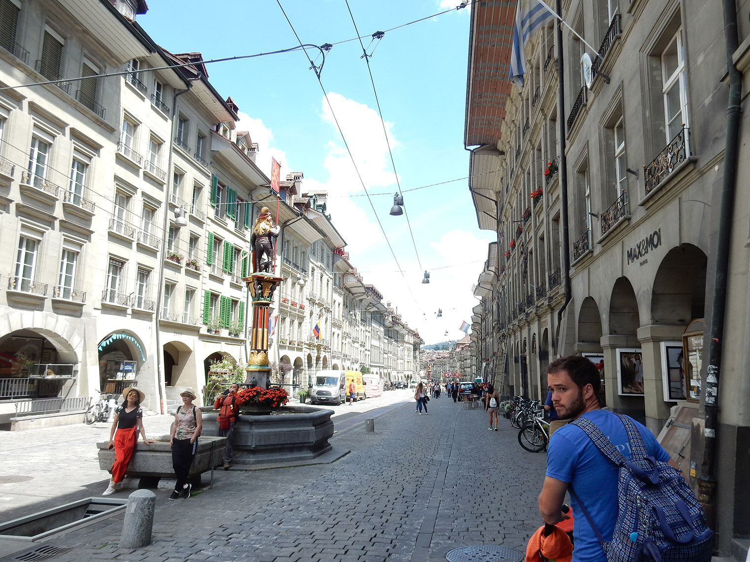 Leaving the station, we emerged into Bern proper. Noah wanted to check out a couple of stores so we did that before making our way to a nearby, and really fancy looking, Indian restaurant for lunch. My impression of Bern at this point was that it's a fairly nice city, though nothing spectacular. Then we finally got to its old town... Now that is what I always imagined a medieval European city to be like. Maybe not with all the fancy modern shops, but just walking down the street and taking in the buildings, statues, and paintings was really cool. If you didn't notice, the "knight" in that photo is actually a bear in armor. Bears are the symbol of Bern, so you'll see them around here and there. There's a park with some live ones as well, though we didn't make it there. The main street of old town stretched on for quite a while before giving way to a still rather old fashioned looking housing area by a river.