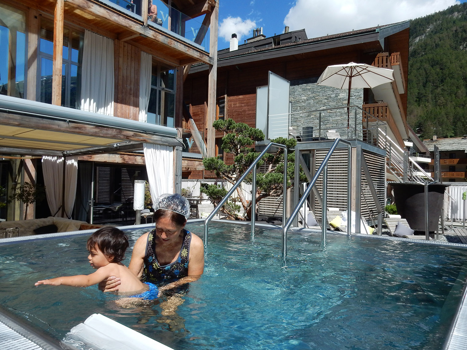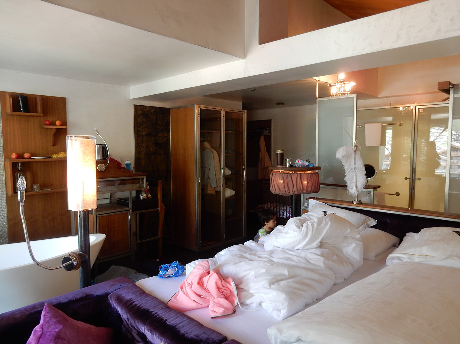We had originally been planning to hike but, while the temperature was ok, it was just dirt and snow as far as the eye could see and we didn't really want to hike over the snow so, after looking around for a bit, we took the train down to a lower station for some different views. Then, finally, it was back down to Zermatt to check our cool but quirky hotel rooms. You don't quite get the full effect from a photo, but it's the best I could do with a single shot. Unfortunately, as cool as the rooms where, they were very very not childproof so keeping Zack from breaking anything or hurting himself was kind of tough. But hey, they did have a nice hot tub.