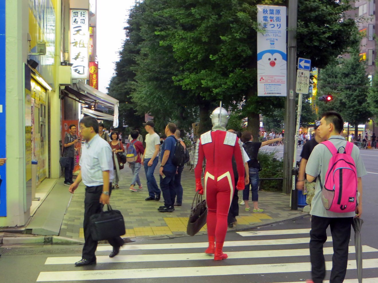 After six weeks of nearly non-stop touring, I was getting pretty tired and, with my rail pass expired, I decided to take it fairly easy for my last couple of days and just have fun in Tokyo. I started out the day strolling around Harajuku. Didn't find the type of shirt I wanted, but it was interesting to see the latest styles (and the long line for the local pancake restaurant). Moving on, I took the train a short distance to Shin-Okubo, which is home to the Korea Town area I mentioned in Saturday's post. I wanted to walk around and get a better feel for the place as well as grab some lunch. Being a Korean area, there are naturally lots of Korean restaurants. Some snack stands too. I tried what I suppose you could call the Korean equivalent of taiyaki or dorayaki. It's a pancake of sorts stuffed with something (the most common fillings I saw were cheese, honey, and red bean paste). I got a cheese and honey mix, which was pretty good. Other than food, there are also a lot of stores focused on Korean dramas and music and the various celebrities therein. Not really my thing, but I have some friends who are seriously into them. Back to the food, while I've never seen it at Korean restaurants in the US, fried chicken is actually a pretty popular Korean food. At least that's what my Korean friends tell me, and the restaurants in Korea Town seem to prove it. It's more like what you'd get at a chicken wing restaurant in the US than typical friend chicken (except it's all parts of the chicken, not just the wings), and every place seems to have their own collection of sauces. The ones I tried between Saturday night and today were a sweet teriyaki-ish sauce, a really spicy sauce, and a peanut sauce. After I finished exploring, and eating, I moved on to Akihabara since I wanted to spend the points on my Yodobashi Camera card before leaving Japan. Ah Akihabara, a place where it's really not that strange if you see Ultra Man walking down the street. I had talked to my family over the weekend, and my dad and brother had been bugging me to try pachinko again, and there's a place I know in Akihabara, so I gave it a shot. I actually started out with a slot machine since it was themed after Madoka Magica (anime based slot and pachinko machines are a pretty big thing). My luck when it comes to games of chance is usually pretty abysmal, but I got off to a good start and tripled the 1000 Yen I put in. But I then proceeded to slowly lose it all over the next hour or so. I did worse in pachinko, losing 2000 Yen in around 20 minutes. So yeah, looks like my lucky hasn't really improved. |