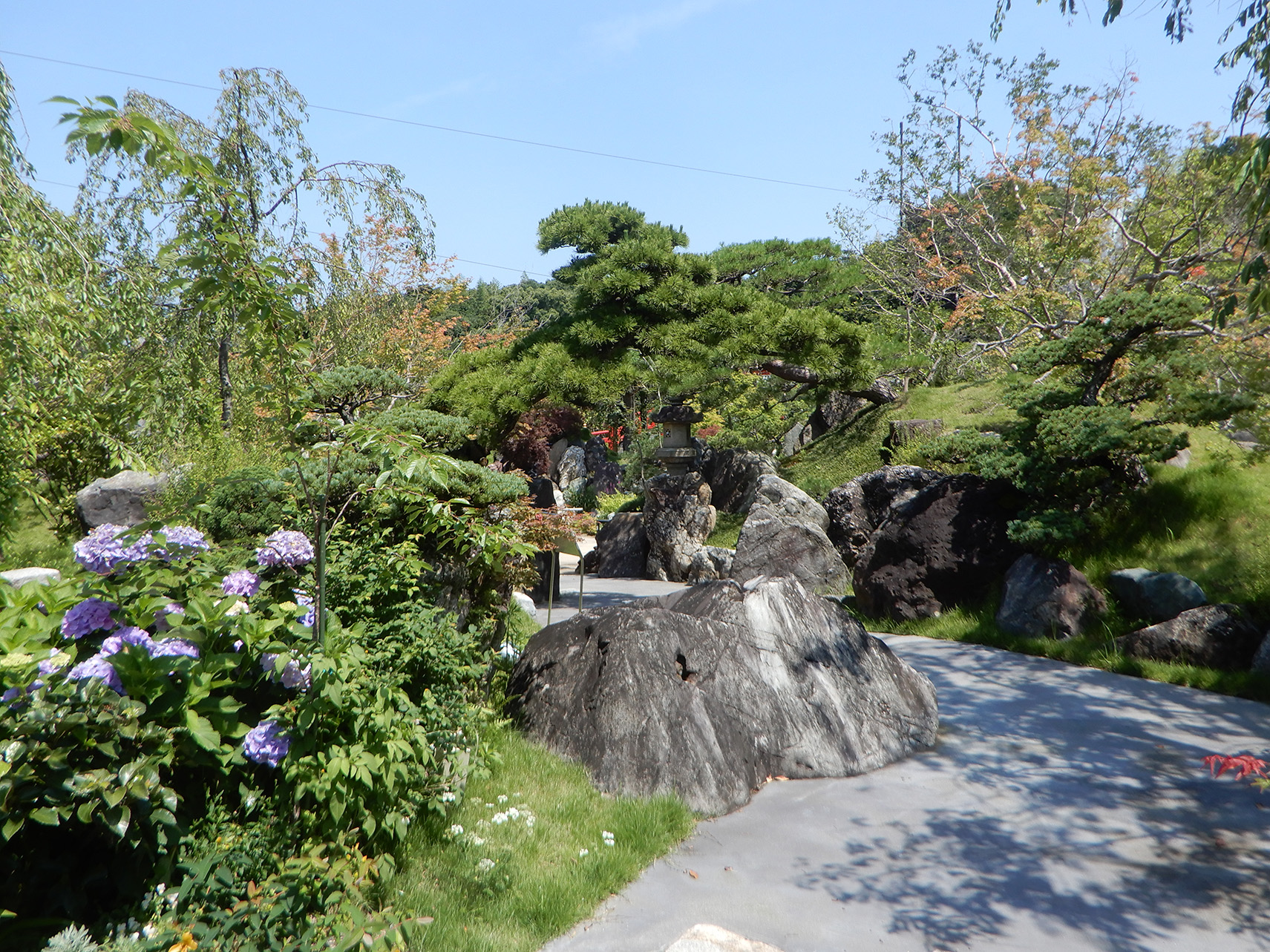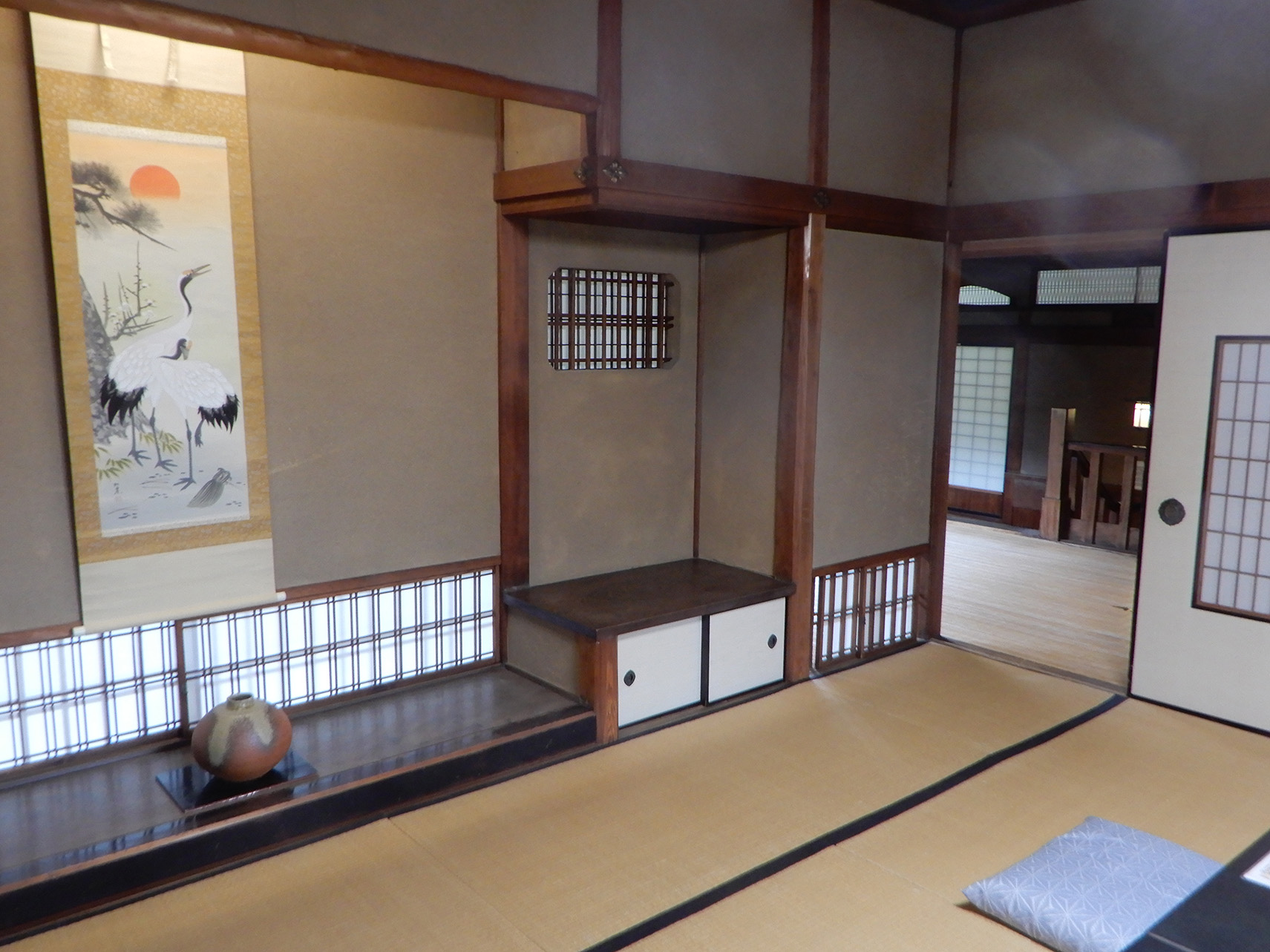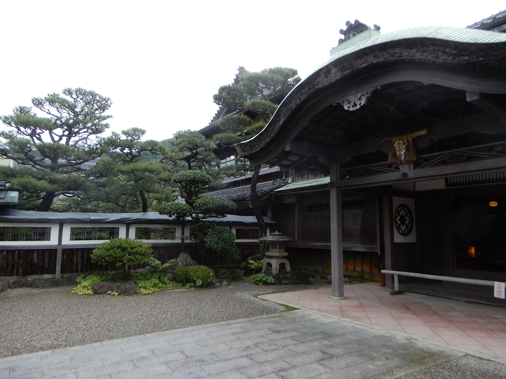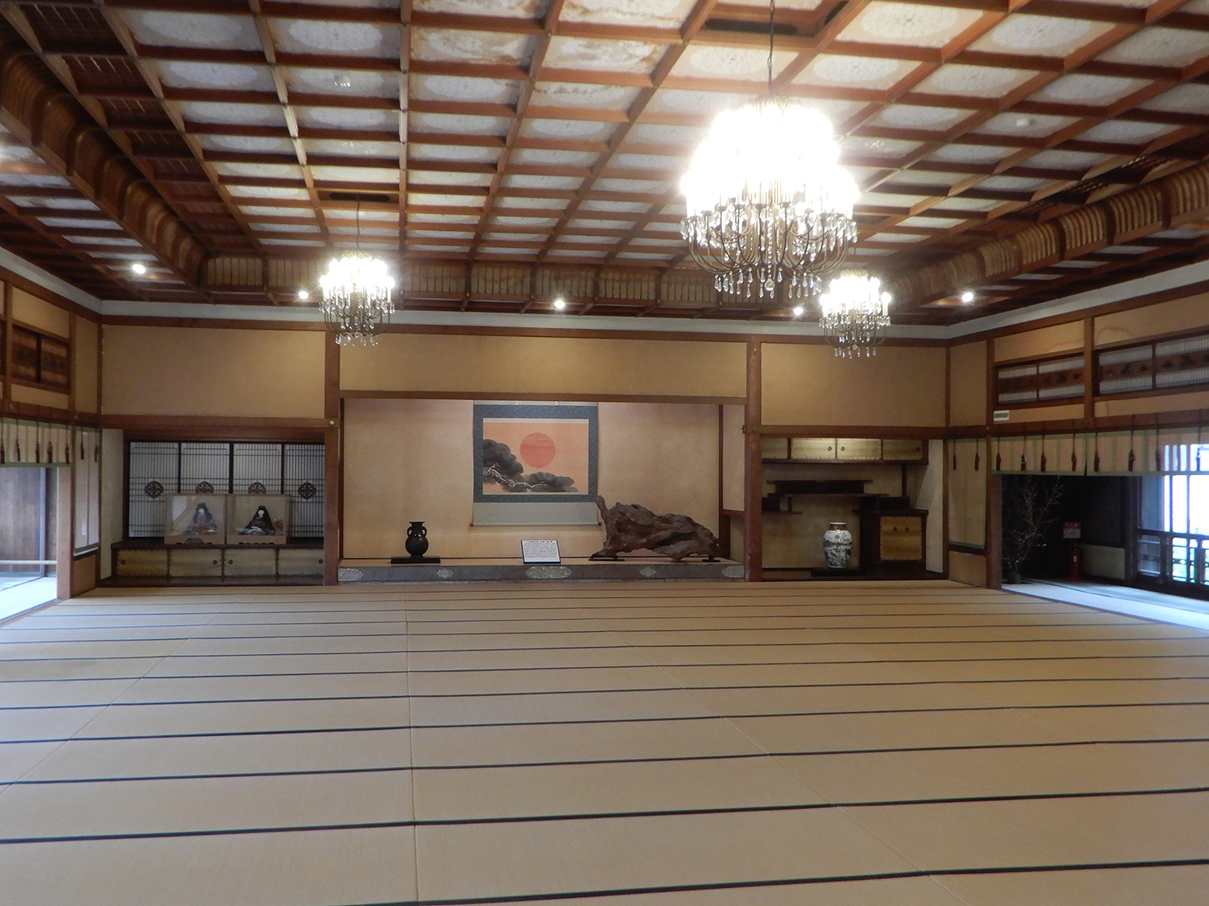 Our first day of sightseeing in the Ise area was also the only one marked for rainy weather. So we planned to spend most of it visiting indoor locations. We started out taking the train a couple of stops to Futami, a small town on the coast. Despite the coastline, it isn't really a beach area as the "beach" is all rocks and gravel. Though you can find some decent seashells there if you look. Our first stop was Hinjitsukan, a villa built in 1887 as a high-end guest house for important travelers visiting the Grand Shrines of Ise (which we'll get to another day). It even hosted one of Japan's emperors when he was young. Now it's a museum and you can explore the guest rooms and other chambers, including a large banquet hall, which even includes a stage for Noh performances. There's a nice garden as well.