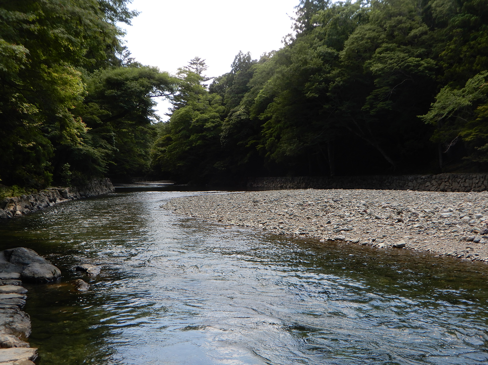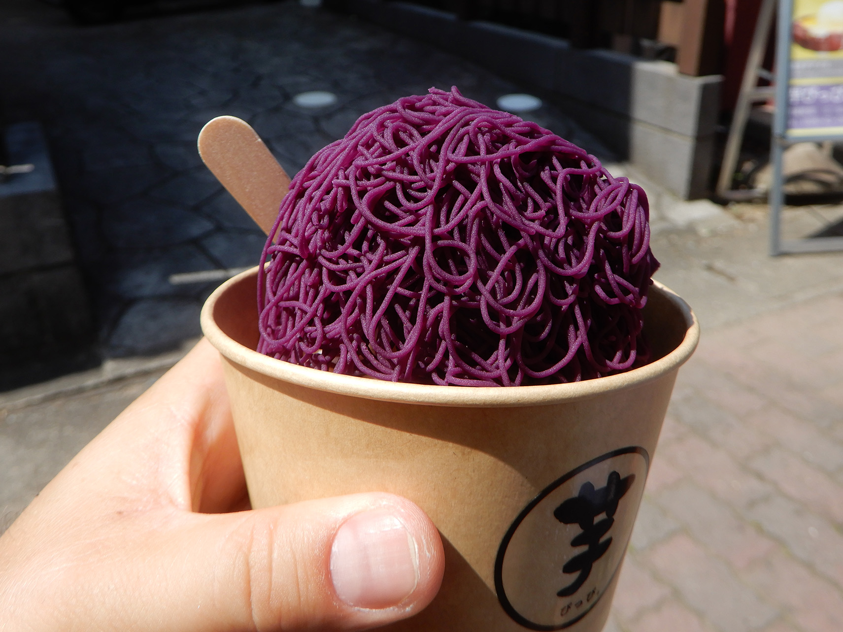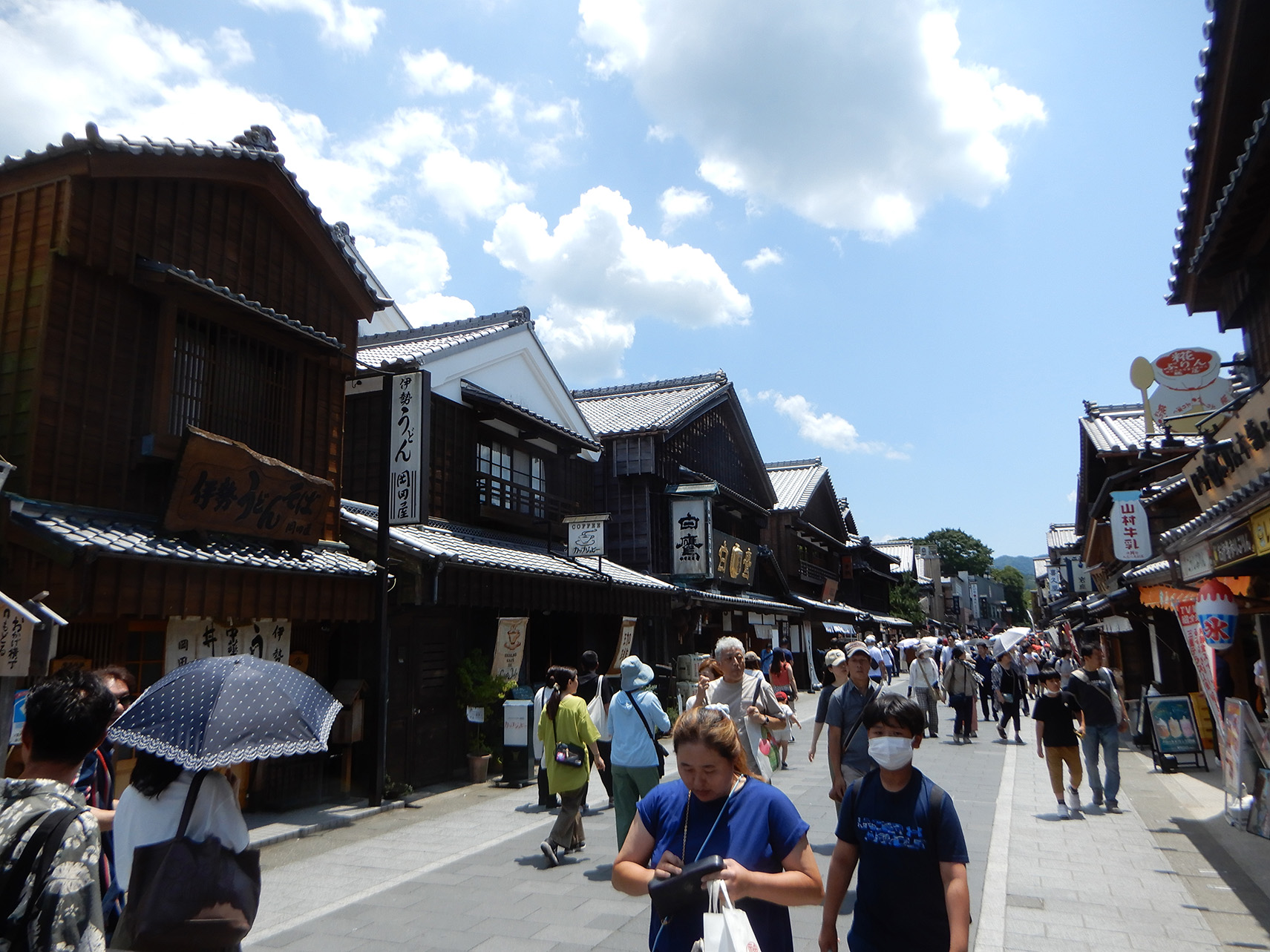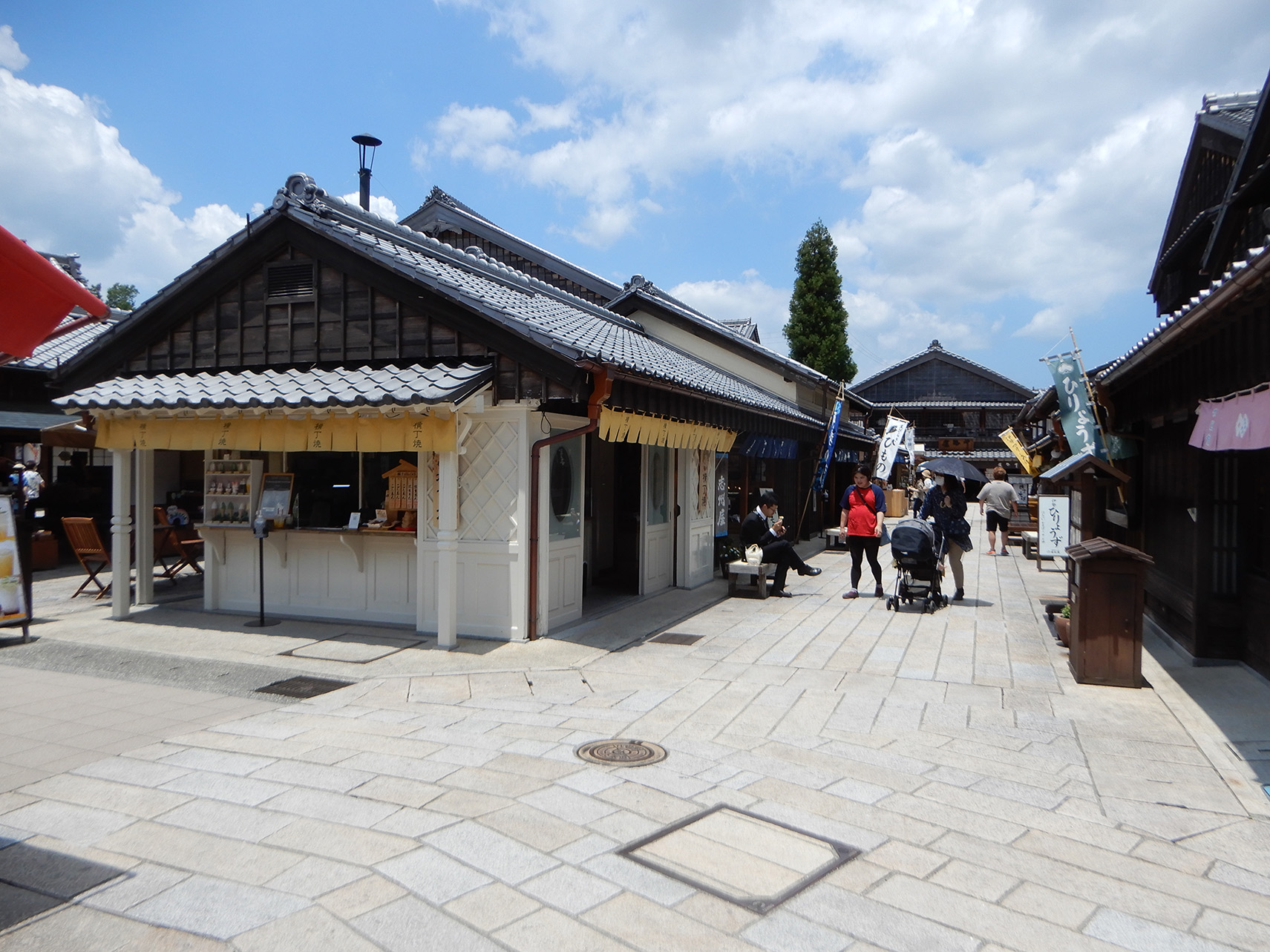 After we'd finished looking through the museum and enjoying the scenery, we started towards Naiku (the Inner Shrine). However, it's all the way across town. There are frequent busses between the two, but we decided to walk instead. It's a bit over 2 miles and takes 45 minutes or so, but it's a pleasant stroll though a mid-sized Japanese town. Nothing too exciting along the way, but I always enjoy walks like that here in Japan. As we neared Naiku, we first reached Okage Yokocho an old-time shopping district full of interesting stores, restaurants, food stalls, and the like. It's a lot of fun to browse and, if I had the time to kill, I could probably just hang around, look through the stores, and snack all day. At the very end of the street is the entrance to Naiku. While much of the complex is in the forest, like Geku, it's set on the bank of a river and has some nice gardens as well. Also like Geku, I'd visit more for the grounds than the shrines themselves, though they're certainly worth a look. One particular small shrine, dedicated to an aspect of Amaterasu, was especially popular, with a long line of people waiting their turn to pray, something I've only ever seen before on certain holidays. We had a nice walk through the Naiku complex then back through Okage Yokocho, where I got this interesting looking snack. If you're wondering, the purple stuff on top is Okinawan purple sweet potato that was run through a noodle maker. Beneath it is a scoop of ice cream and a slice of Japanese yellow sweet potato. We were making good time so I decided to fit in one more stop. After taking a bus back to Iseshi Station, we wealked northeast to the Kawasaki district. It's set by a river and used to be a major trade hub a couple of hundred years ago due to all the Japanese people making pilgrimages to the Grand Shrines. A number of the old warehouses still remain, though it's not really a tourist area so many of them are private businesses or residences. A few have been turned into shops and restaurants though and one, Kawasaki Shoninkan, serves as a museum about the history of the area. It's interesting to walk through and you can see some cool items, like early paper money that was used in the district before Japan as a whole adopted paper currancy. However, almost nothing was in English and the museum is a bit out of the way so I wouldn't really say it's a must see. When we were done, we walked along the river for a bit then ended up taking a train back to Matsuaka for more yakiniku. |