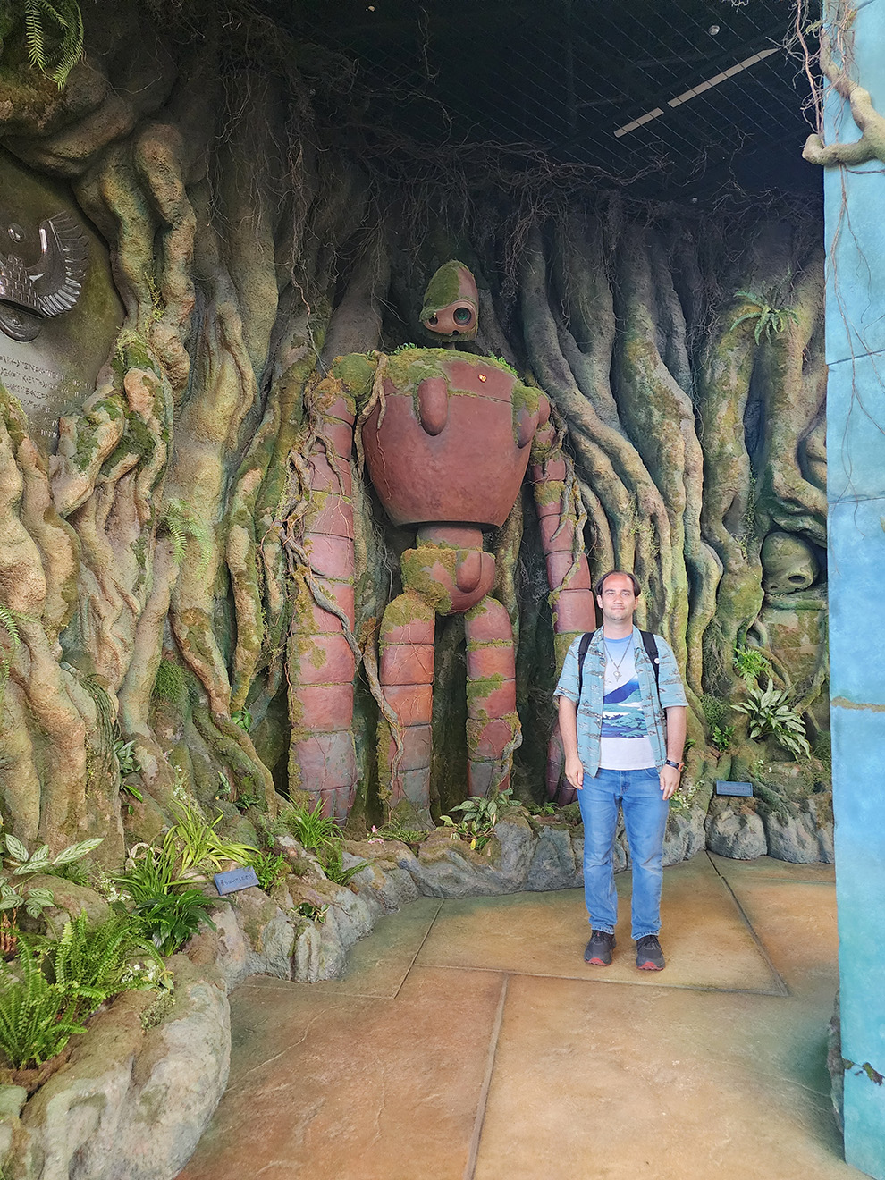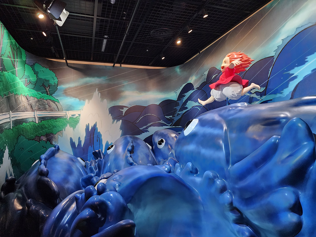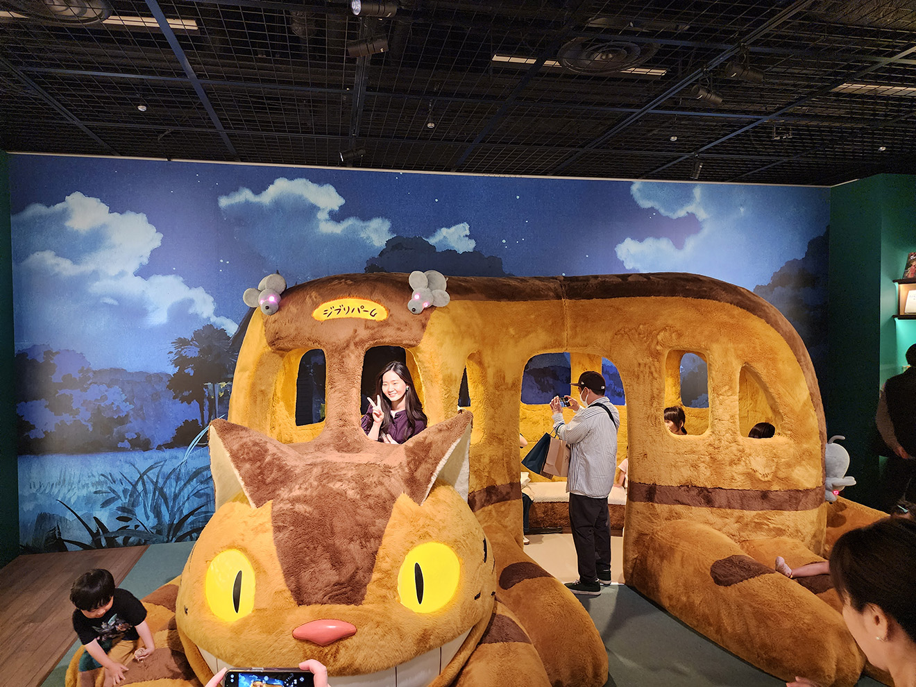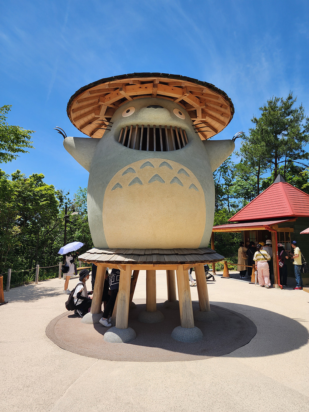 Anyway, I set off early so I could get there around when the park opens. Just after exiting the train station, I ran into this fancy elevator...which I ignored other than the photo since, it's a fairly easy walk down the hill and I didn't want to wait in line. Neat design though. Now, it's important to realize that Ghibli Park isn't anything close to Ghibli Disney World. First off, it's made up of several different locations scattered throughout a much larger public park, which also features things like a skating rink, playground, museum, kids' center, etc. Walking through the park is free, and you can get a look at some of the Ghibli areas that way, but actually entering each area requires a ticket. My warehouse time wasn't until 1 - 2 PM, so I started off going clockwise from the elevator to see what I could find. The first area I encountered was the Hill of Youth. It contains recreations of a couple of buildings and other structures from various Ghibli movies such as The Cat Returns and Whisper of the Heart. The biggest part is a recreation of The World Emporium from Whisper of the Heart, but going inside there requires that premium ticket I mentioned earlier. It was fun to look around a little and pose for a photo or two (one of the main activities throughout the park), but there was no reason to stay at the Hill of Youth for very long. Continuing on through some trees and flower fields, I found a cat bus station. You don't actually need a park ticket to ride the cat bus, but you do need to buy a separate bus ticket either way. It runs between some of the most distant parts of the park, though you can always ignore it and walk. There's also a fairly large cat themed playground if you have kids, but that also costs extra. Right past those, however, was the next area, Mononoke Village (based on Princess Mononoke, obviously enough). That statues are eye catching (one even doubles as a slide for small children), and there's a snack stand. But the main focus is Tatara-ba. In addition to being rather picturesque, if you go inside you can pay an extra fee to learn how to grill gohei-mochi (a type of sticky rice on a skewer, covered in sauce), which you can then eat. Back by the cat bus, you can also buy a cheap ticket to go to the overlook for the Valley of Witches. Note that it's just an overlook. The valley itself is included in the park ticket and is entered elsewhere. But it doesn't cost much, you get your choice between a short hike and tram, and it's a nice view. I took the tram up, hiked down, and then walked over to the Valley of Witches. The Valley is the largest area and the only one you can re-enter after leaving. There's a nice looking restaurant (which had a very long line when I passed), along with some snack stands and the bakery from Kiki's Delivery Service if you want something to eat. If you're not looking to eat or buy some souvenirs, it also has the park's only two rides (if you don't count trams and the cat bus), though they're aimed squarely at kids. But the main draw is all the neat buildings, most of which are recreations of places from various Ghibli movies (mainly ones with magic, hence the Valley of Witches). I was able to enter some of them, but several, including the Okino Residence (Kiki's family's house) and Howl's Castle require the premium ticket. That was a bit disappointing, since Howl's castle especially looks fantastic from the outside and I'd love to go in. In case you're wondering, these premium ticket buildings don't contain rides or anything, they're just highly accurate recreations of buildings from the movies, so you can step into the worlds of your favorite characters. Even without the premium ticket, I did have fun exploring the valley and there was a lot more to see and do than in the previous areas. Next up was the Dondoko Forest, but that one is a bit remote compared to the others, requiring a 600+ meter walk through the forest. It's also pretty small. There's a big Totoro that kids can play inside and there's a recreation of Satsuki and Mei's house from the same movie, but that's about it. Unsurprisingly, the house requires the premium ticket, but there is a free view point in case you don't have one. The forest is also next to a nice little free Japanese garden, so I took a different route back, going through the garden and around a pond or lake before returning to my starting point for my warehouse entry. As previously mentioned, the Grand Warehouse is the only part of the park that requires timed entry, though once you're in you can stay as long as you want. And you'll probably want to stay for a while. Despite being indoors, its larger than most of the other areas and much more densely packed. Upon entering, you're given a ticket you can use to go see one of a handful of exclusive Ghibli short films. It's the same selection as at the Ghibli Museum and they rotate periodically. The current film plays throughout the day and you can go to any show, though only once. The current one (which I fortunately hadn't seen before) was about a lost puppy making its way through town in order to find its way home. Very cute. There's also some exhibits. I'm not sure if they're all permanent or some rotate like at the Ghibli Museum, but when I visited there was one focused on "everything Ghibli" and one on food in Ghibli movies (which once ran for a limited time at the museum). There was also the long promised adult sized cat bus. The warehouse also contains a pretty large children's play area, some shops, a cafe, and an actual warehouse where they store old display stuff. But most of it is dedicated to recreations of scenes from various movies, such as the robot from Castle in the Sky, Arietty's house and garden, and many, many more. In fact, there was at least one major photo spot for just about every Ghibli movie. Many had a bit of a line, but the most popular by far was this one from Spirited Away. Getting that picture with No Face required 30 - 40 mi