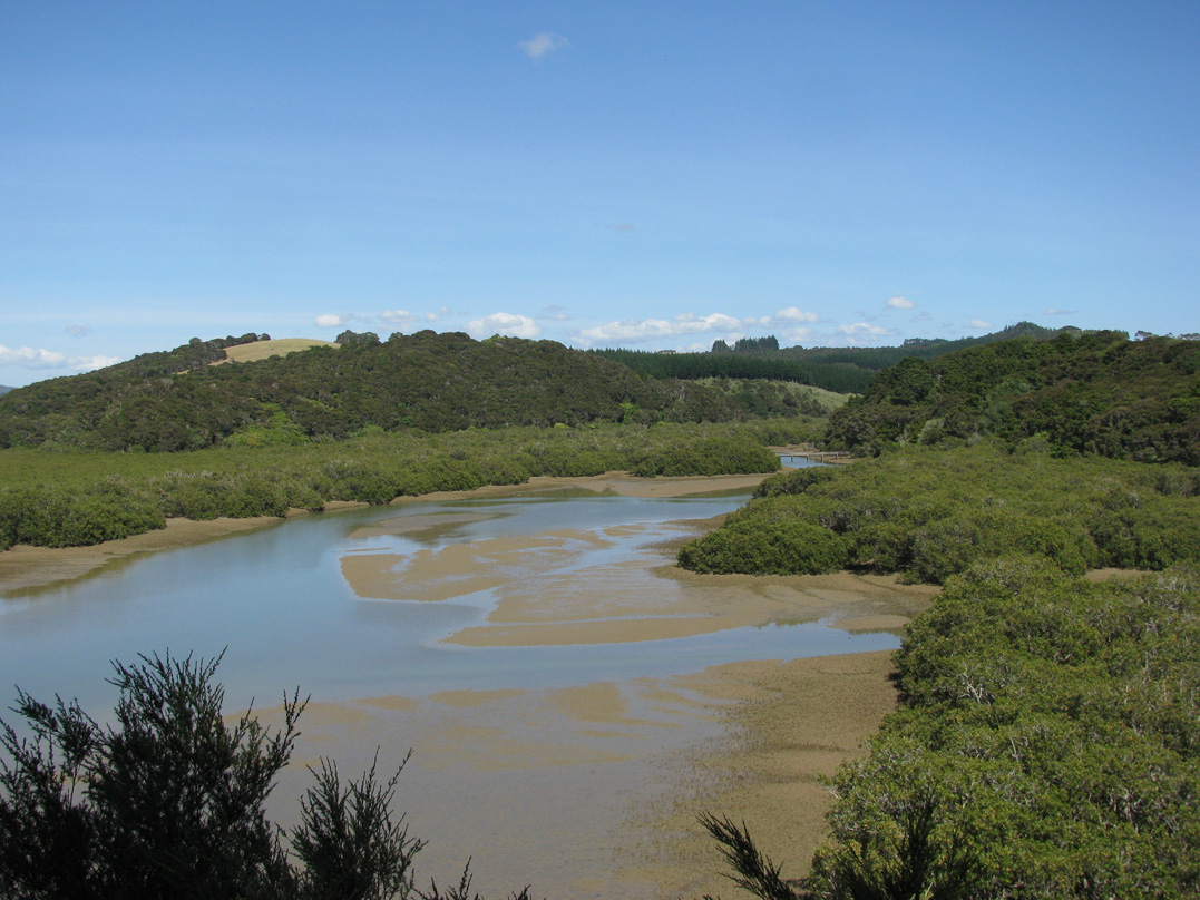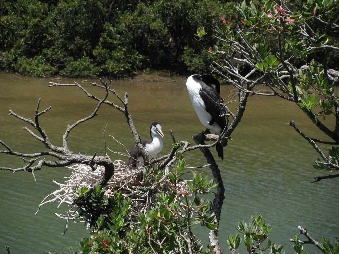 Today we took a hike to the Haruru Falls. Since it was a 10 kilometer hike (five each way) my dad wanted to get a fairly early start. Despite a minor snag with the GPS routing us on some small, slow, curvy country road, we got to the trail head ok and headed out. The trail started out in a forest next to a river. Here's a shot of me in the forest. It eventually led out onto a boardwalk through a mangrove forest. The tide was out at the time so we could see the local "wildlife". Can you spot the mud crab? There was also snapping shrimp there. We didn't see any, but you could actually hear them snapping. Never thought shrimp could make so much noise... After the mangroves, there was more regular forest followed by the Haruru Falls themselves. We stopped there for a lunch break before heading back. Along the way, I snapped some pictures of some of the shags hanging out and nesting in the nearby trees. There were even some babies (though rather large ones). The babies warbled (both noisy and silently) quite a lot. It was a little weird. After the hike, we returned to the hotel and I gave the beach another try. I actually got in the ocean for a while. It was cold at first, but I got used to it after a bit. Still no waves though. Now that I think about it, I haven't been to a beach with waves in a really really long time. Several years at least. Maybe not since before college. I'll have to keep that in mind for future vacation planning... Random New Zealand Comment: Animals |