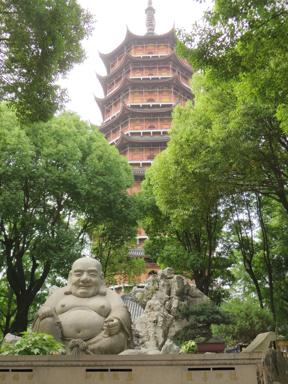 But anyway, I got a tourist map and headed off to my first destination, though I got distracted on the way by this very unique temple. My actual destination, Shofukuji Temple, wasn't all that special by comparison, but it did have the most cheerful Buddha statue I've ever seen and, surprisingly a few banana trees. There was also a wall made out of broken roof tiles. That isn't especially unusual in old Japanese architecture, but this one used some dragon shaped tiles, giving it a rather cool look.